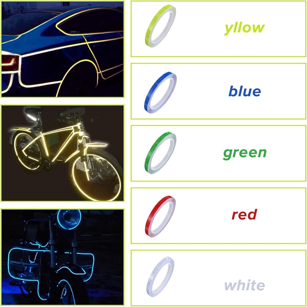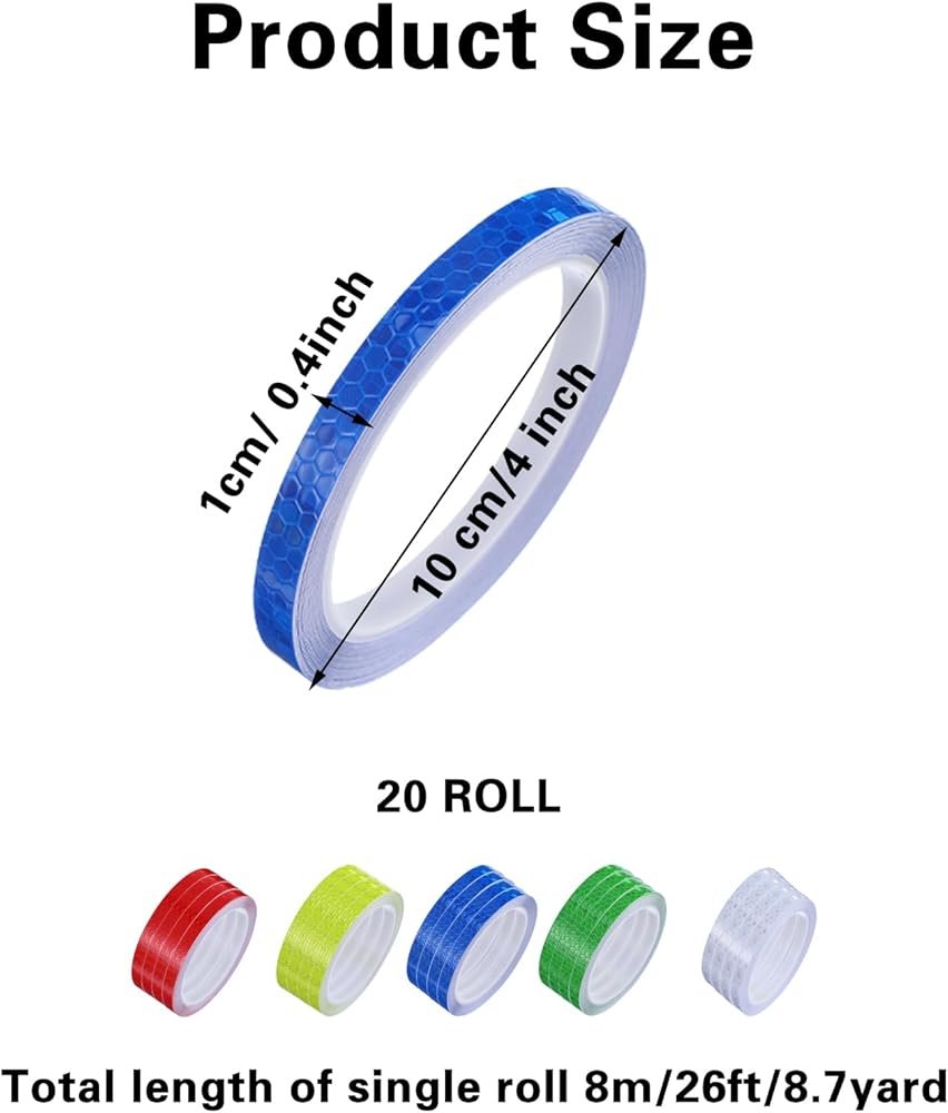 【Package Includesl】You will receive 20 rolls reflective tapes(white, bule, red, yellow, green), each color have 4 rolls. the length of a single roll is 8m/26ft, totally 160M/ 175 Yard. which is enough to meet your daily needs.
