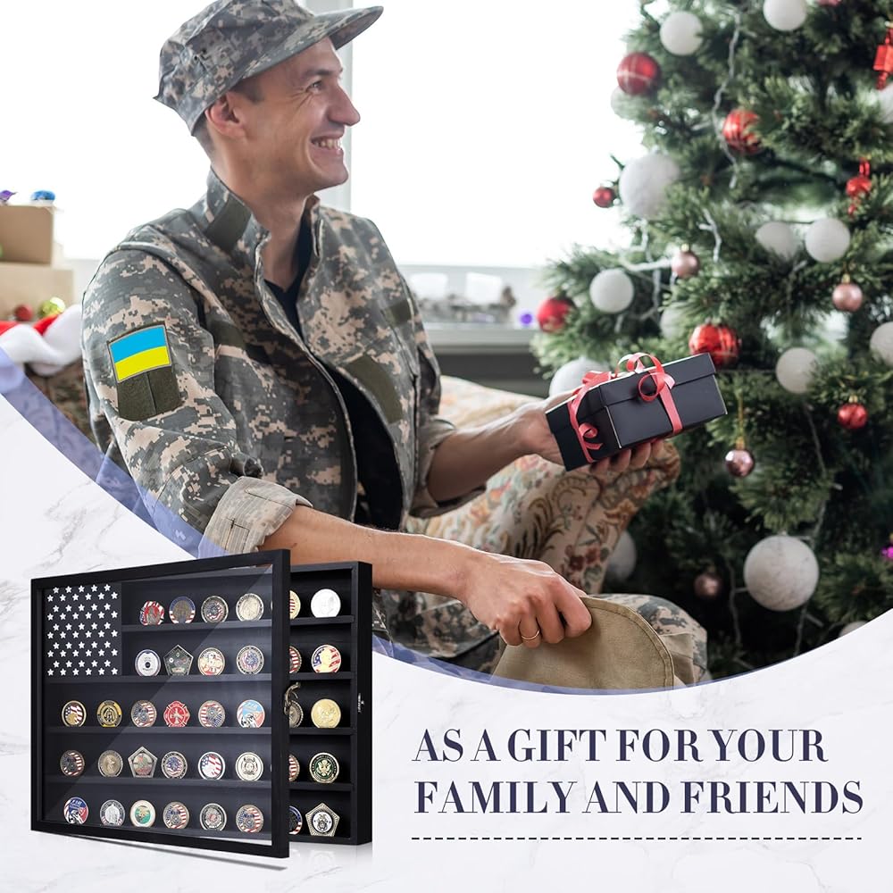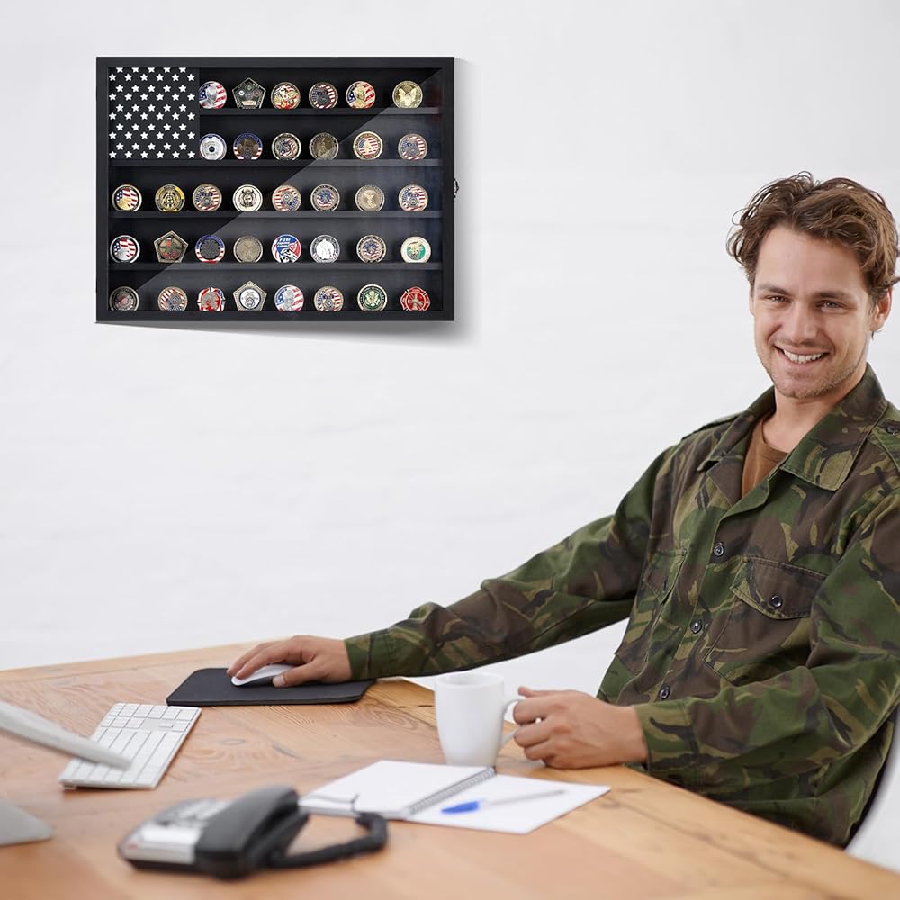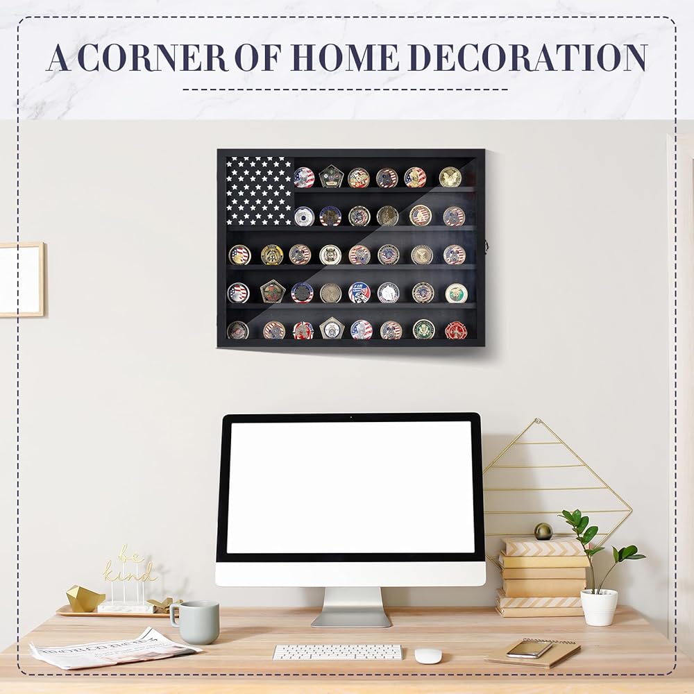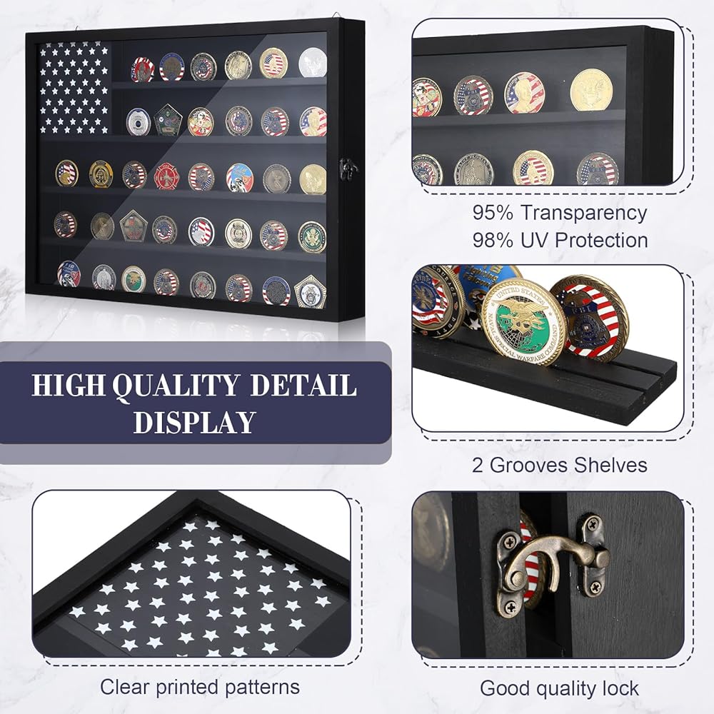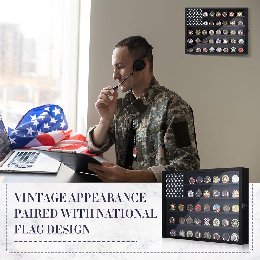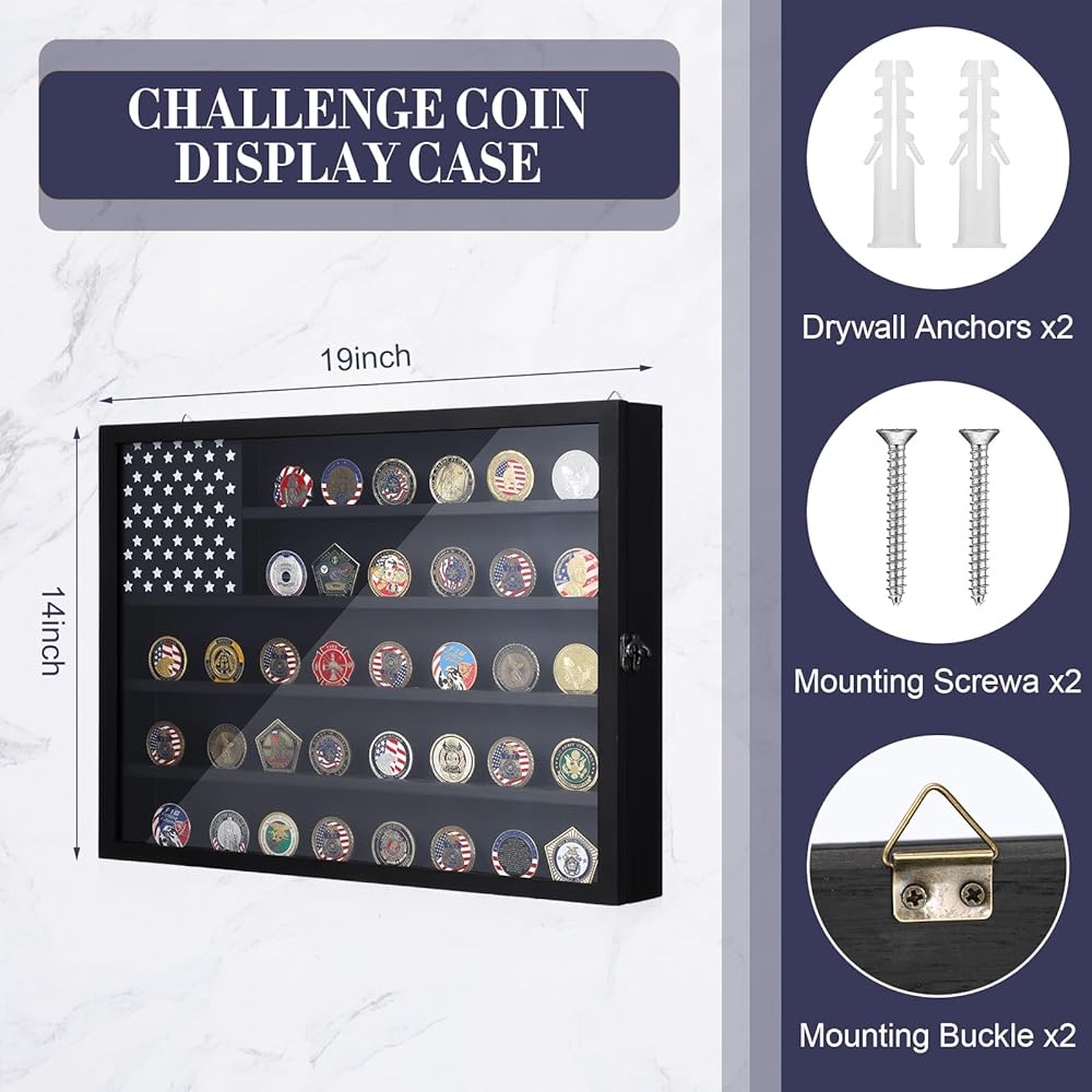 Easy Display: the challenge coin wall display does not require complex assembly; It arrives ready for use and is equipped with hooks on the back for easy wall mounting; Its special design featuring an American flag pattern enhances the decor of your room and exhibits your coins with patriotism