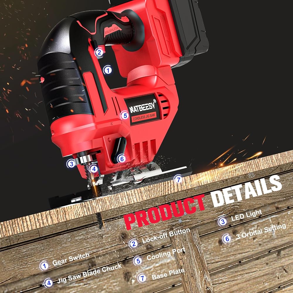 • محرك بدون فرشاة بسرعات متغيرة: محرك بدون فرشاة 20 فولت من NATBEESY مع مقاومة للحرارة والجهد المنخفض وحماية من التحميل الزائد، يوفر المنشار اللاسلكي إعدادات سرعة متغيرة تتراوح بين 2900 دورة في الدقيقة. هذا التنوع يجعله مثاليًا لمجموعة واسعة من التطبيقات