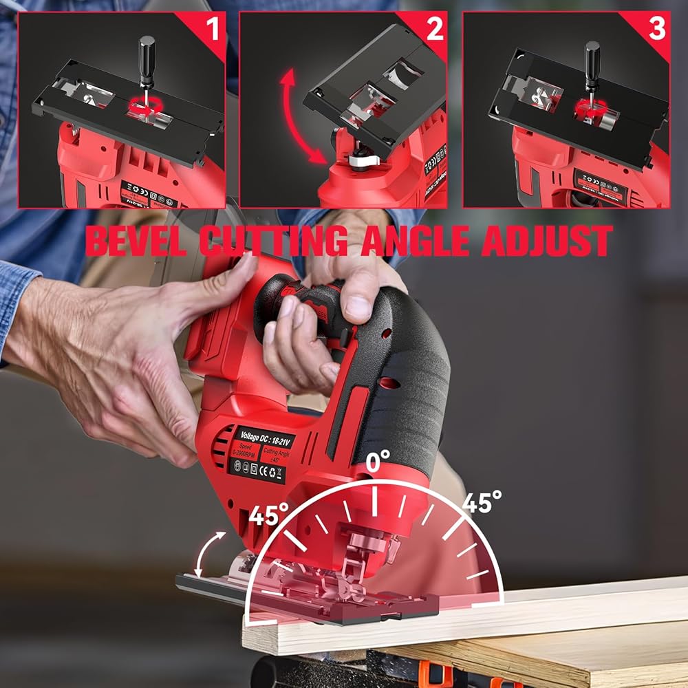 • مثالي لمختلف التطبيقات: يتميز المنشار اللاسلكي بدواسة قاعدة قابلة للتعديل، مما يسمح بقطع مائل دقيق عند 0 و15 و30 و45 درجة على كلا الجانبين. مع 3 إعدادات مدارية (0-2)، يجعلها مناسبة لمجموعة واسعة من المواد بما في ذلك الخشب والفولاذ المقاوم للصدأ والبلاستيك والخشب الرقائقي. يوفر المنشار الصغير أقصى عمق قطع يبلغ 80 مم للخشب و8 مم للفولاذ الطري، مما يضمن قدرته على التعامل مع مهام القطع المختلفة بدءًا من القطع المستقيمة والمنحنية وحتى التطبيقات التفصيلية.