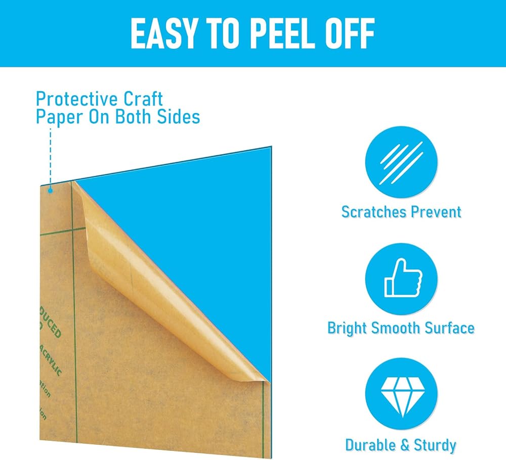 • Double Sided Filmed: Our acrylic sheets 1/8 thick have rigid structure and high scratch resistance, also weather and UV resistance; Each colored acrylic sheets comes with double-sided protective films to prevent scratching while transporting; please make sure to peel them off before using