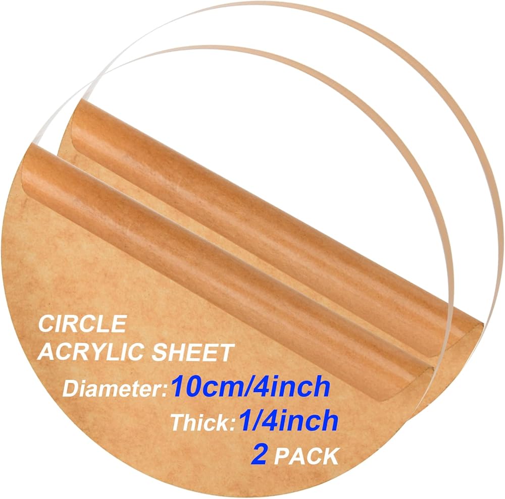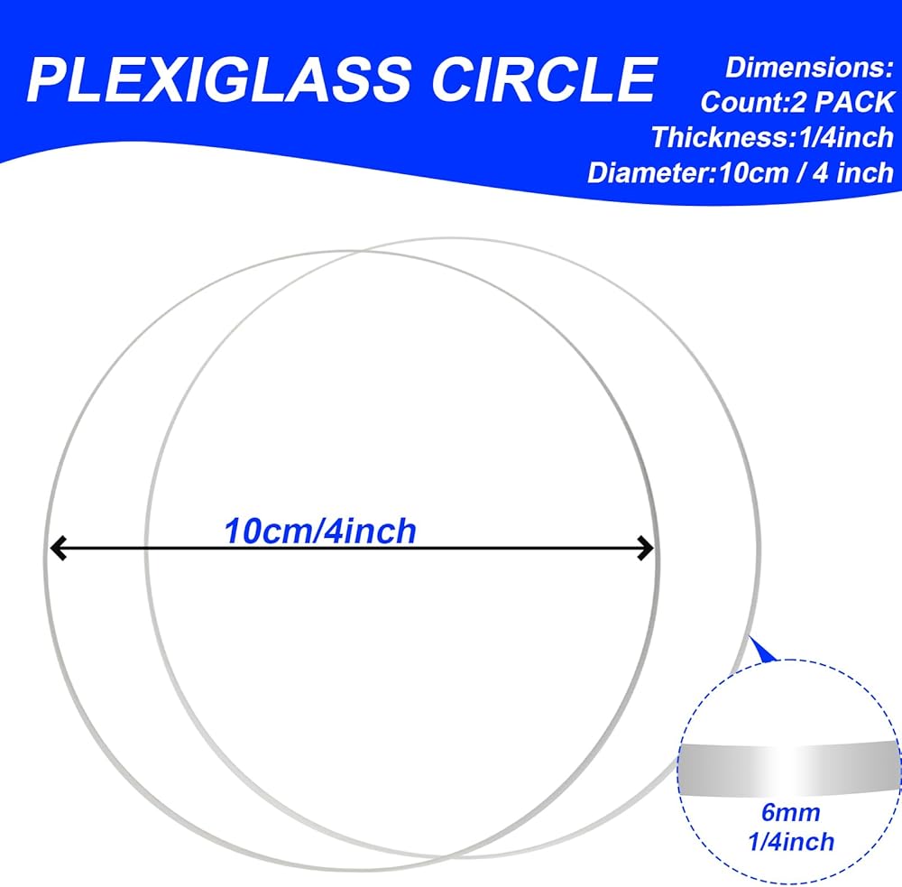 Package Contents: Each package includes 2 pieces of plexiglass acrylic circles - 4 Inch Diameter - 1/4" (6mm thick). Note: The sheet comes with protective film on both sides to prevent scratches, be sure to remove it before use.