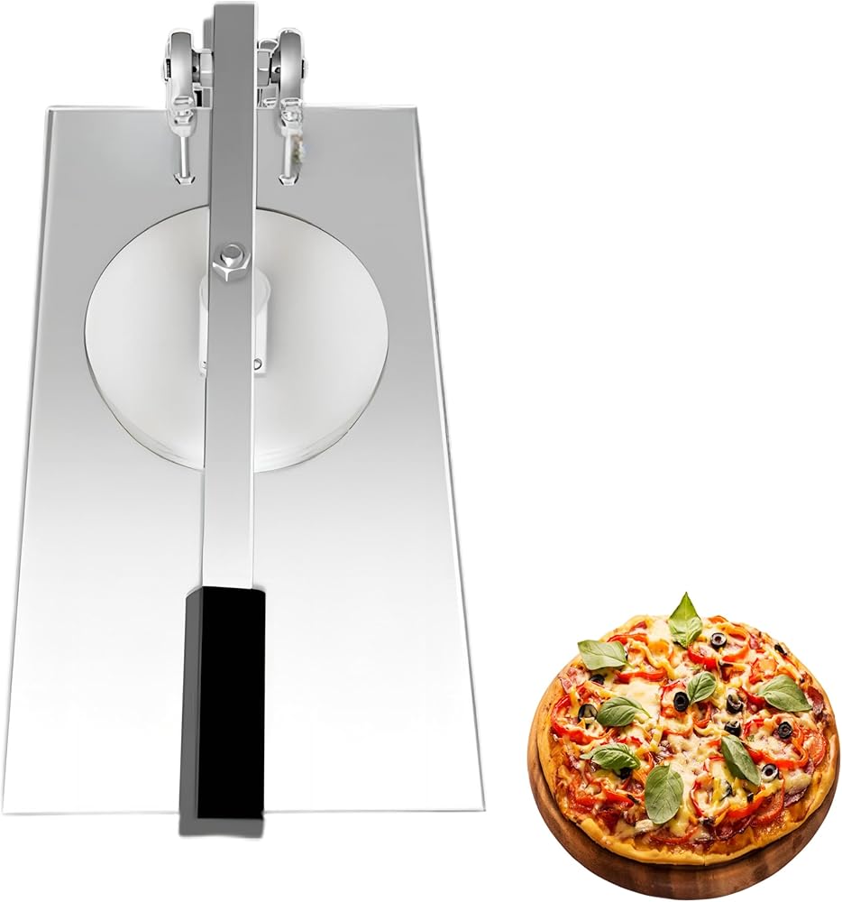 Pizza Dough Press Machine features a central screw on the press platen that allows you to easily adjust the dough thickness, enabling you to select the perfect thickness for your pizzas, pies, pastries, etc.