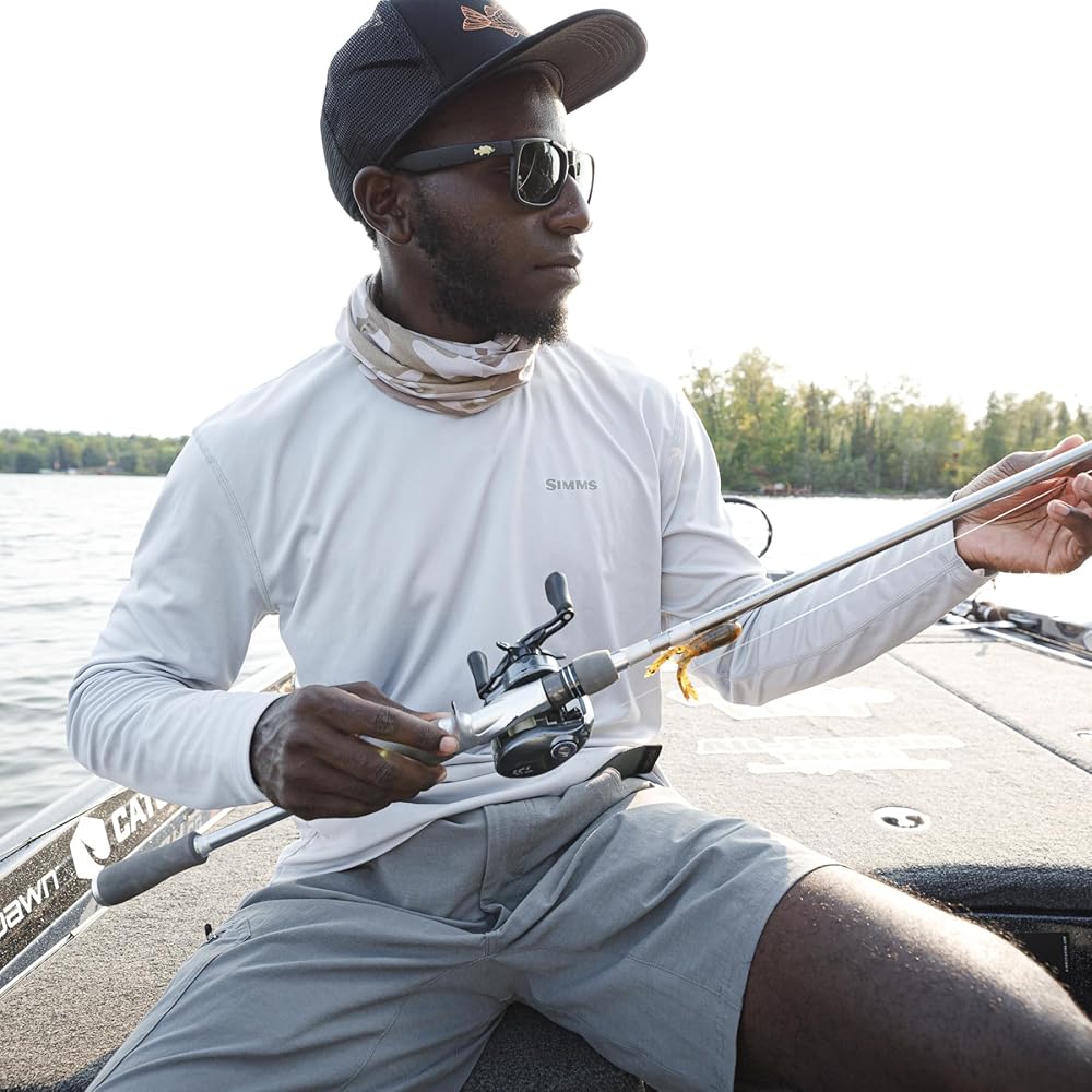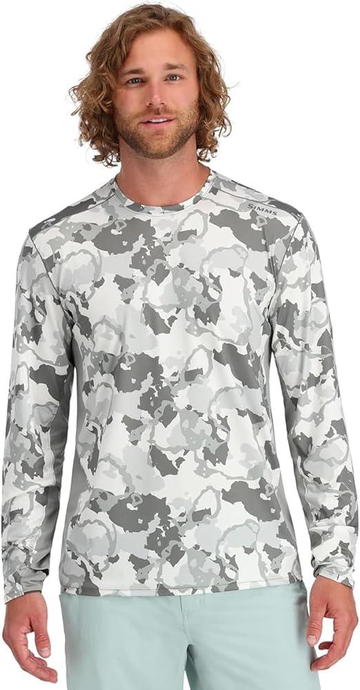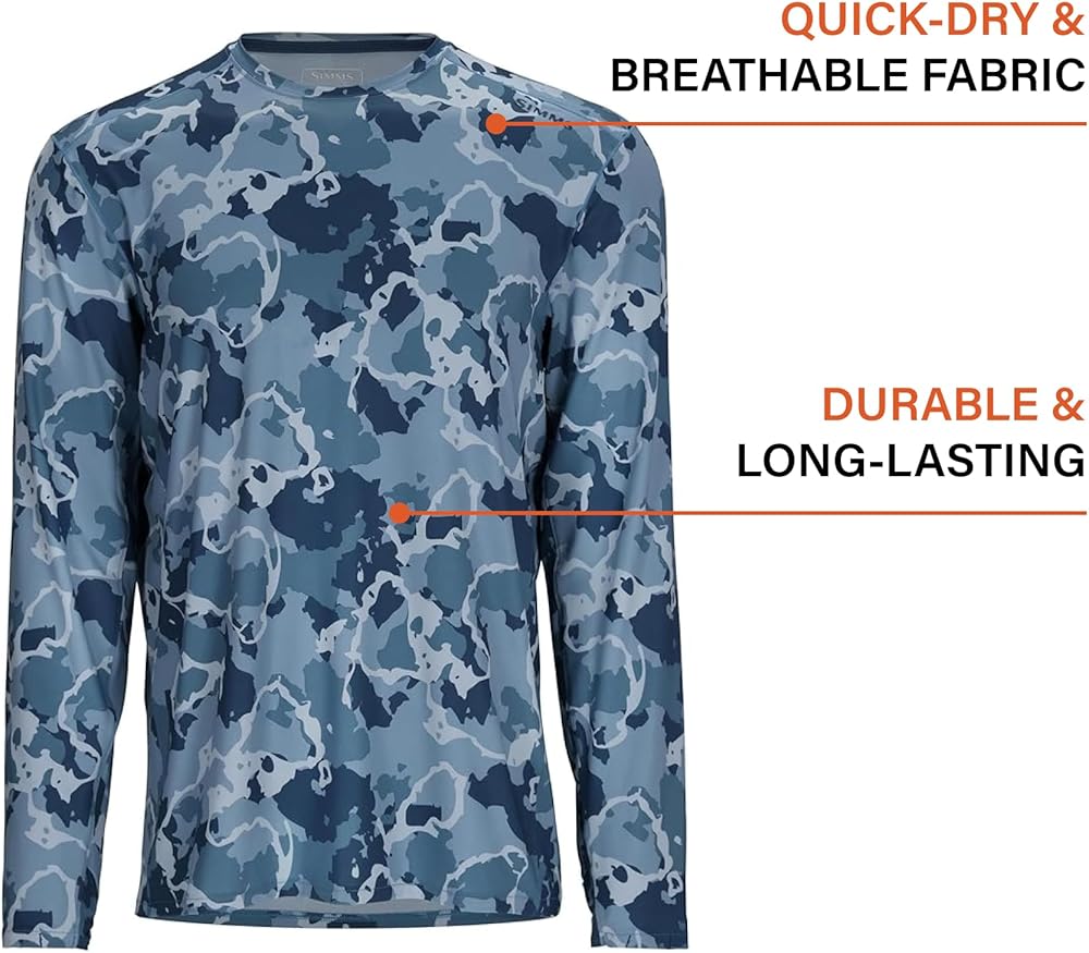 قميص صيد السمك Simms SolarFlex بأكمام طويلة ورقبة مستديرة للرجال: حماية من أشعة الشمس بعامل حماية من أشعة الشمس 50+، سريع الجفاف، مقاوم للرائحة (فوج مموه نبتون، كبير)