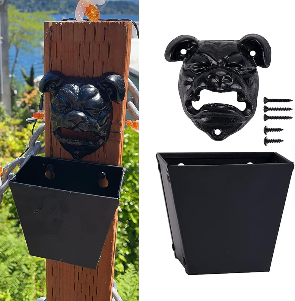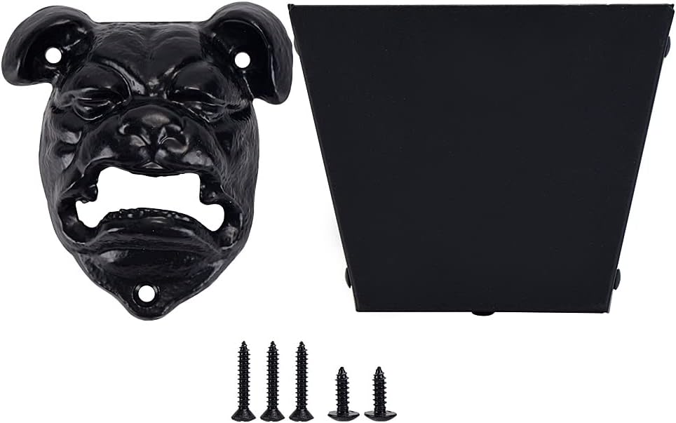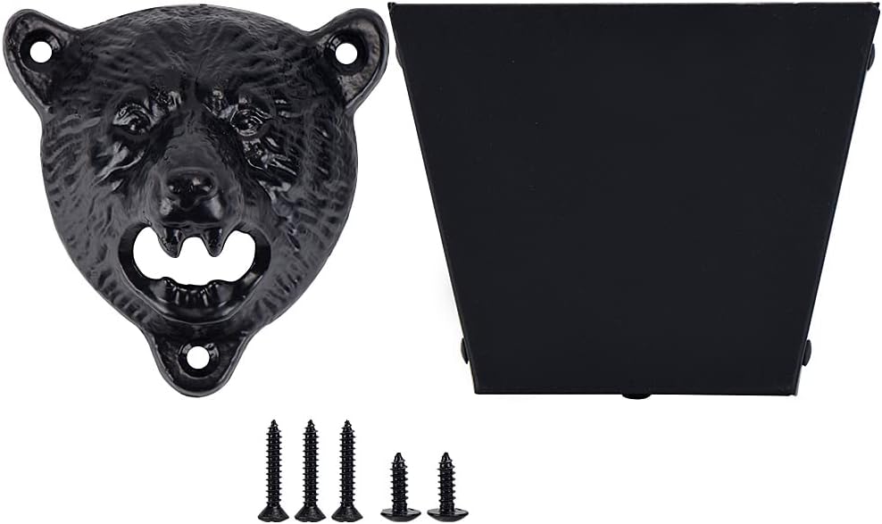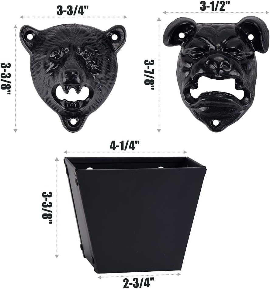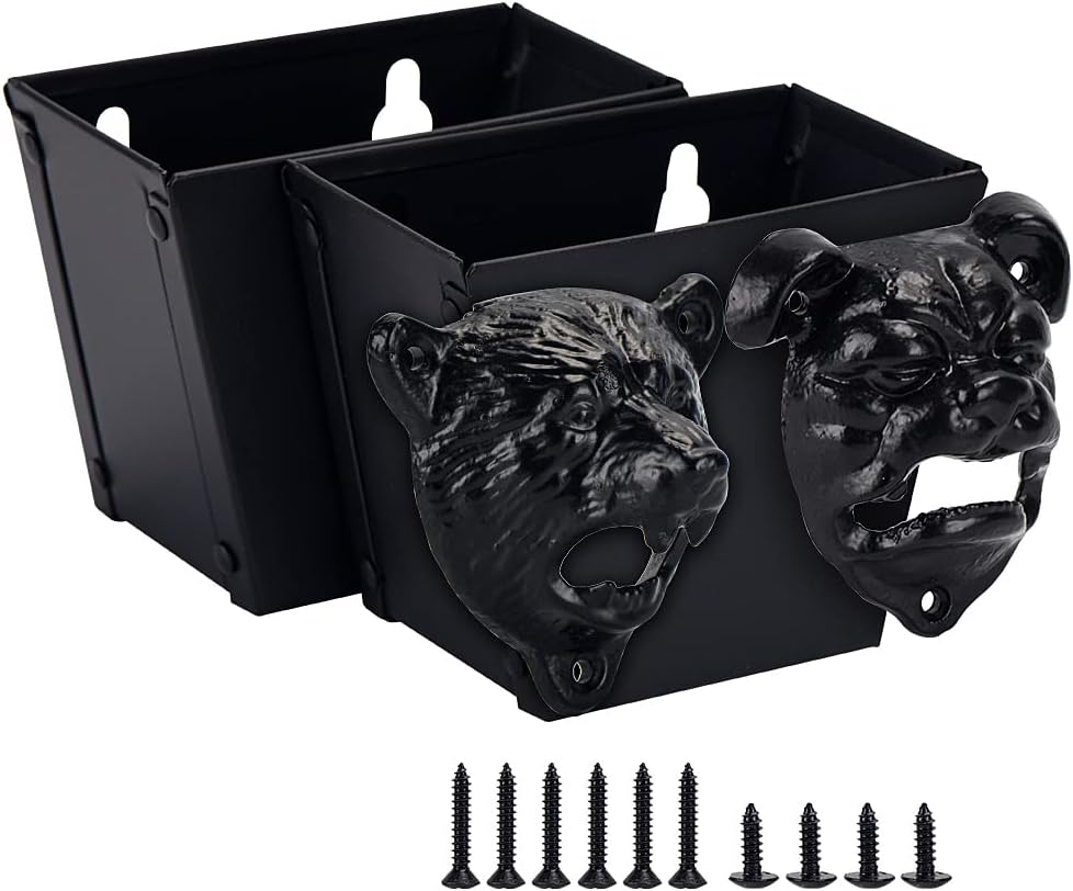 عبوتان من فتاحة زجاجات خارجية باللون الأسود، رأس دب أشيب من الحديد الزهر مثبت على الحائط + فتاحة زجاجات لعض رأس البلدغ مع قطعتين من أدوات التقاط أغطية الزجاجات للبيرة والمشروبات الغازية، أدوات منزلية رئيسية