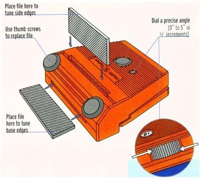 Side and base edge bevel multi tool that includes a file. This one tool is all you need to sharpen and bevel your edges. Dial a precise angle from 0 degree to 5 degrees in 0.5 degree increments. It is recommended that you set the edge bevels with the file and then replace the file with 70-mm diamond stones to maintain the sharpness; if you always use the metal file, you will wear away the edge. The blue DMT or Red/Yellow Moonflex is a good choice, add the whole set if you are a racer. Bonus Benefit for this tool: If you don't know what base and side angles your ski/board are set to, this tool can help you find them. Before you start mark the metal edge with a sharpie, start the tool at the lowest angle and see if it removes the marking on your edge. Raise the angle step-wise and repeat until it removes the mark. That is your angle! Record the base/side angles for future reference. Detailed edge tuning instructions are located under Tuning Tips in the top menu. There are two ways to determine the cutting direction for the metal file in the tool: (a) you can run the back of your fingernail across the file. Your fingernail will run smoothly one way and the other way (the cutting direction) will produce small shavings from your fingernail on the file; or, (b) look closely at the file with a magnifying glass. You will see that the file teeth point in only one direction. You pull the file in the direction that will cause the most friction against the ski edge (the cutting direction).
