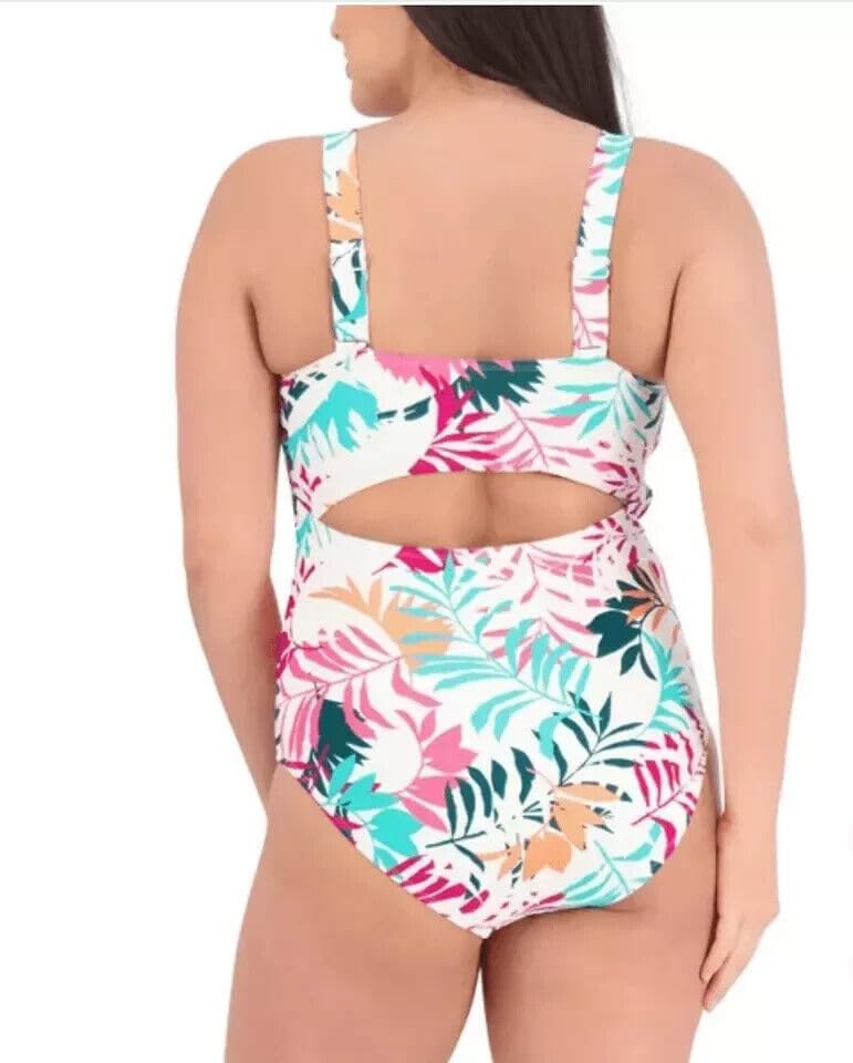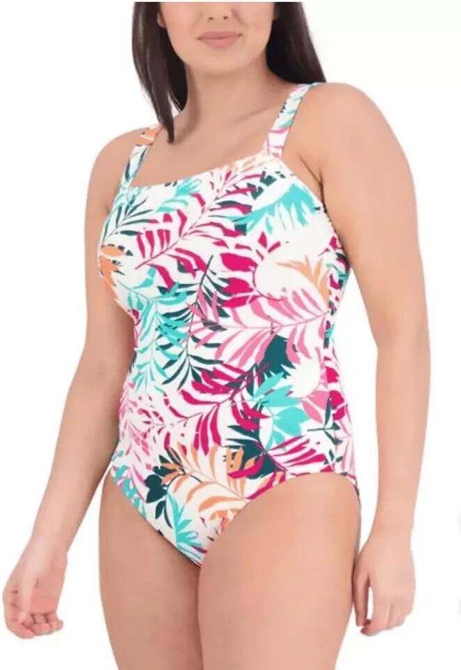 Vibrant Tropical Print: This one-piece swimsuit features a lively tropical leaf print in eye-catching hues of pink, teal, orange, and navy.