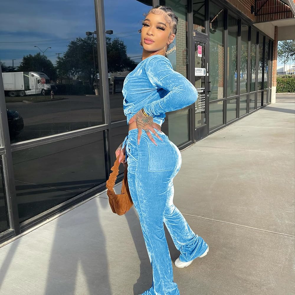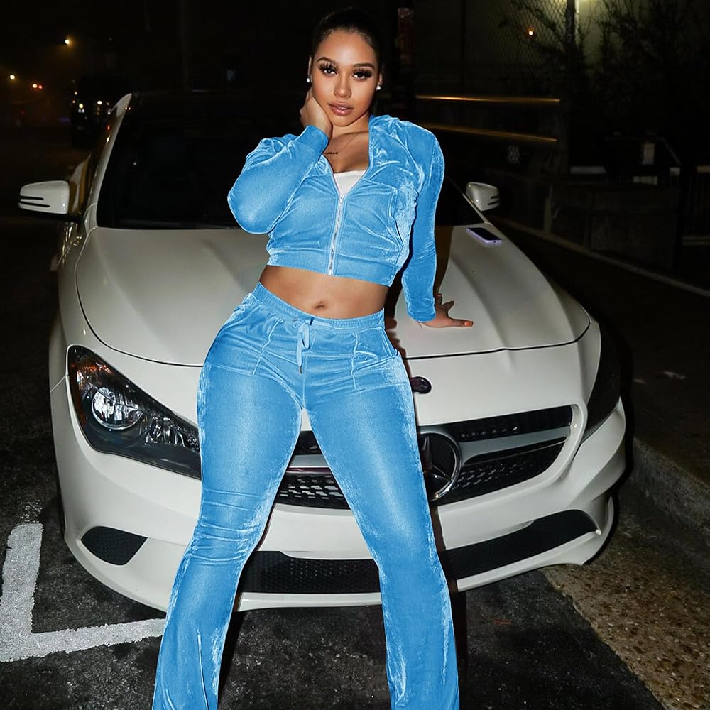 Womens velour tracksuit set include : 1 * solid color zip hoodie up crop top, 1*solid color long elastic sweatsuit pants.