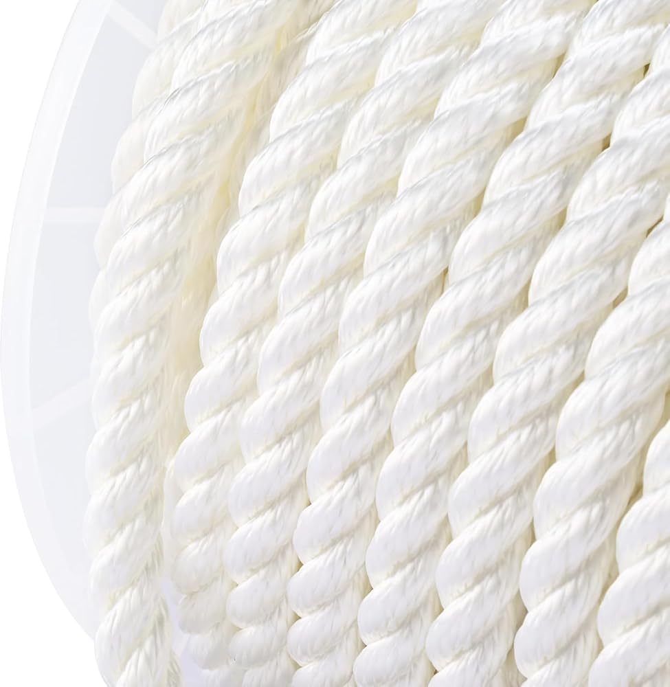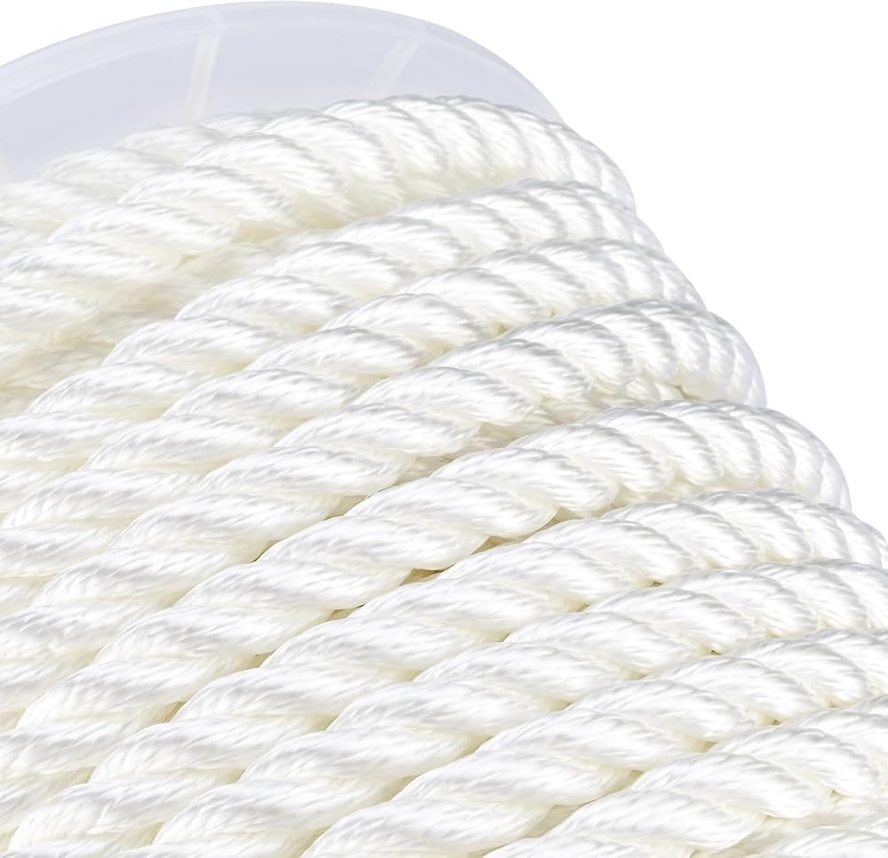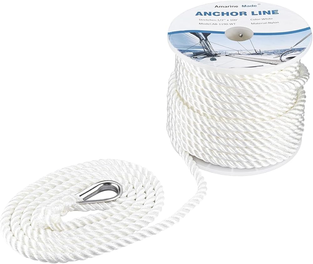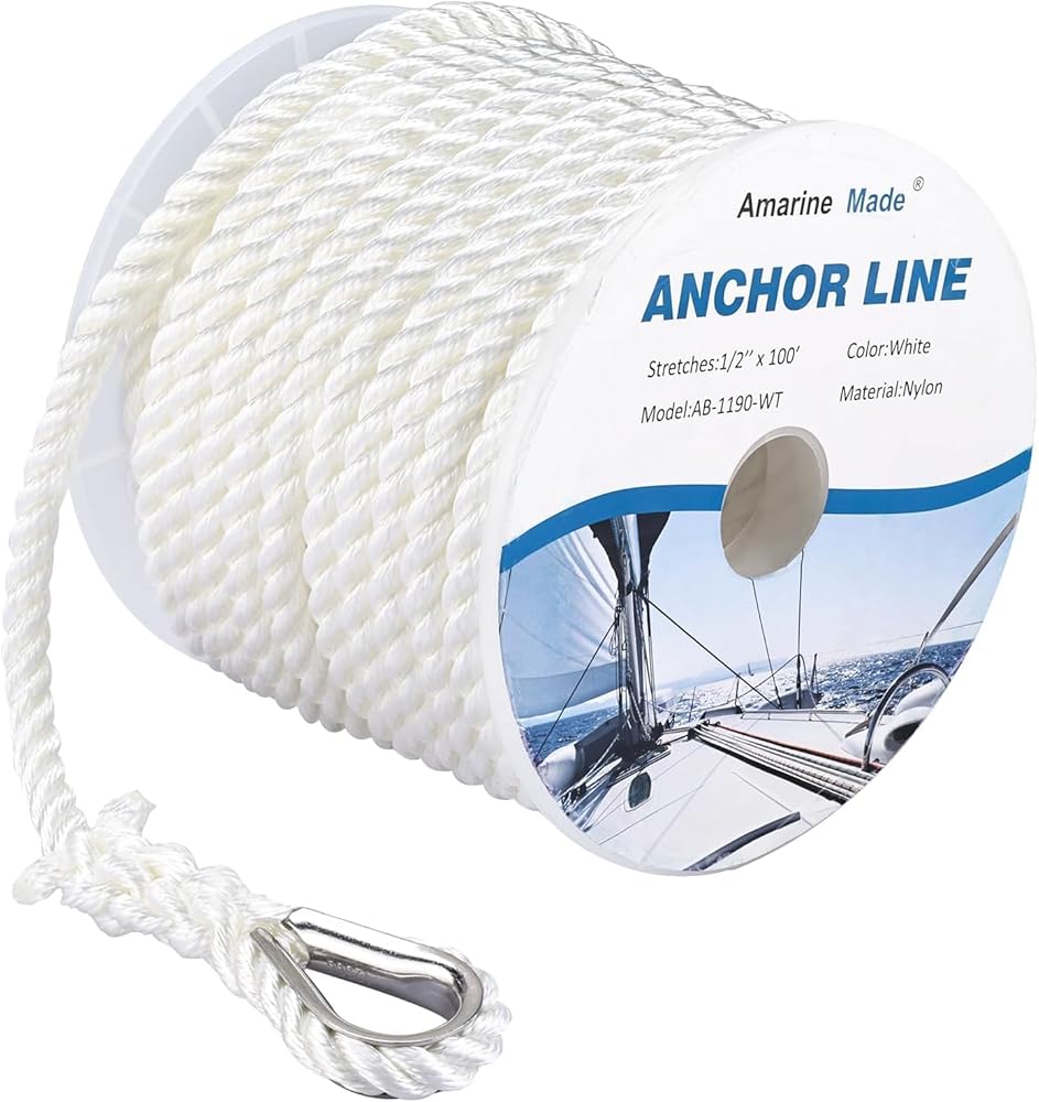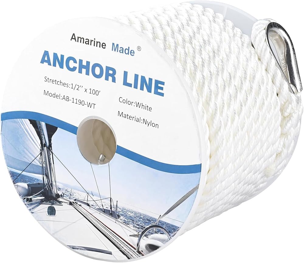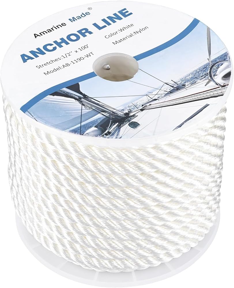 Amarine Made 1/2in 100ft خط مرساة، 3 حبل مرساة نايلون ملتوي، حبل مرساة أبيض متعدد الأغراض، حبل مرساة صلب مضفر للقوارب، والرسو، والسحب