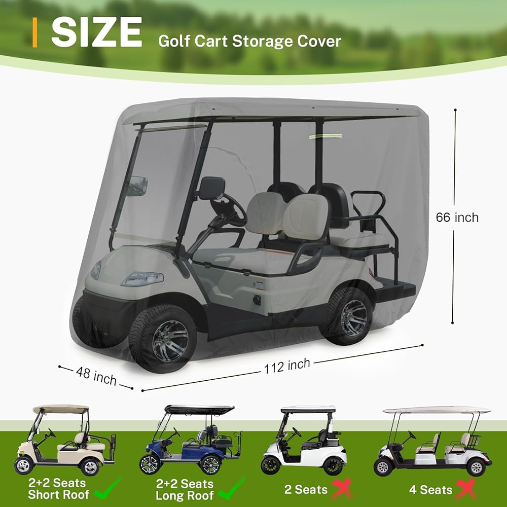 يناسب معظم عربات الجولف - بقياس 112 "L x 48" W × 66 "H ، هذا الغطاء متوافق مع أسطح طويلة تصل إلى 80" طولها 2+2/4 Ezgo ، و Club Car ، و Yamaha Golf Carts ، والمزيد . (يرجى التحقق من أبعاد عربة الجولف الخاصة بك لضمان نوبة مناسبة!)