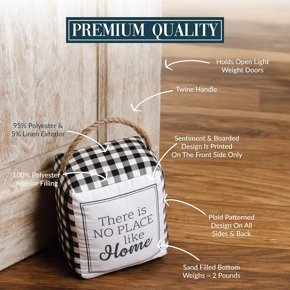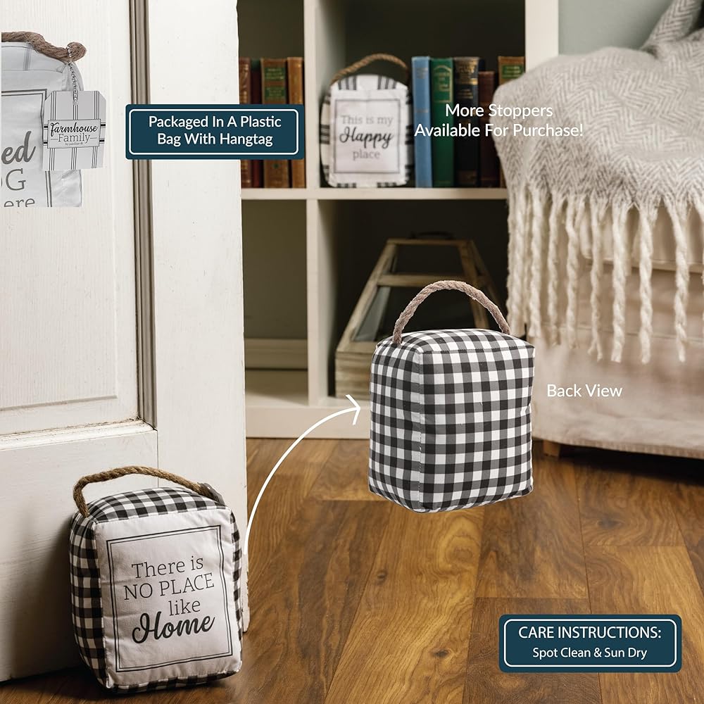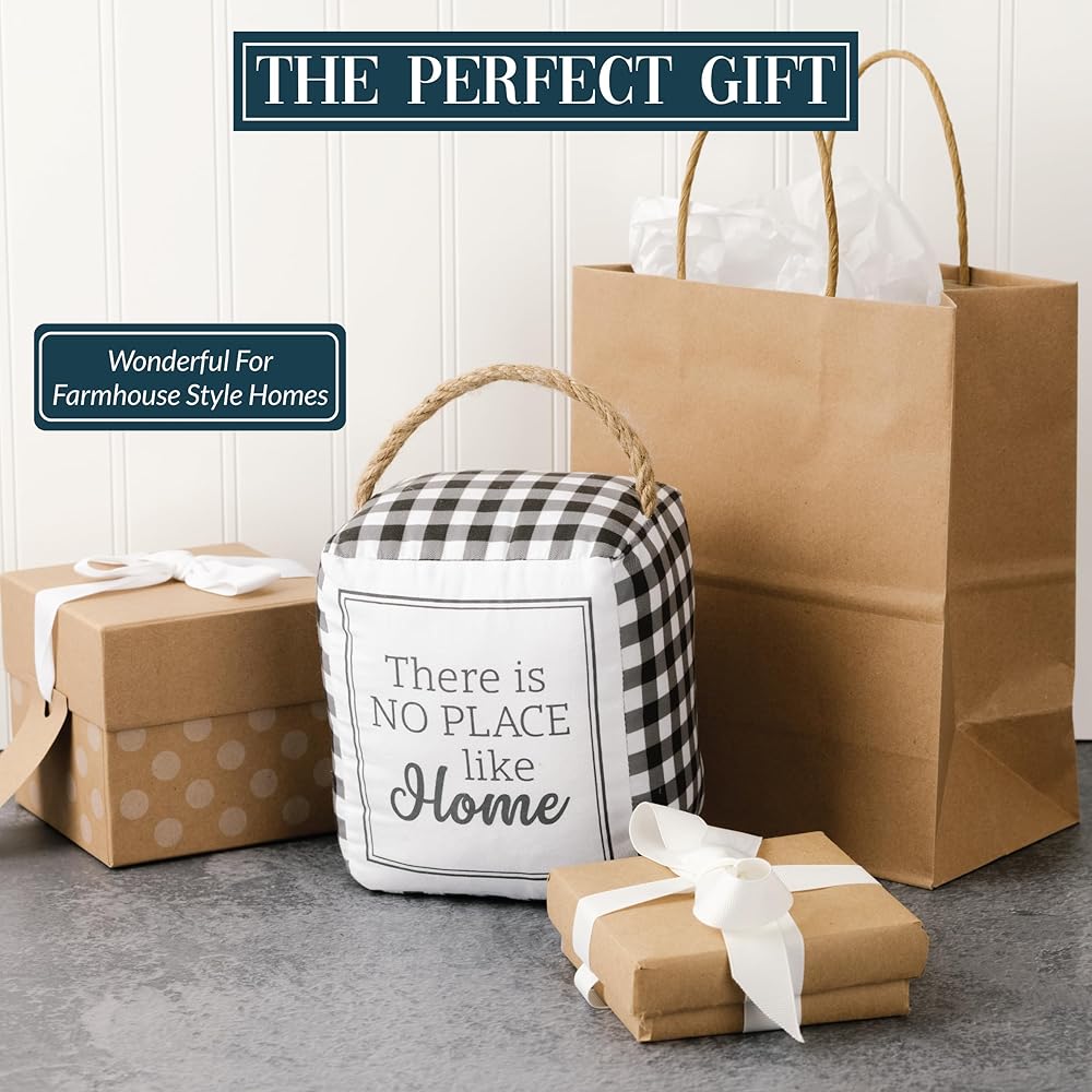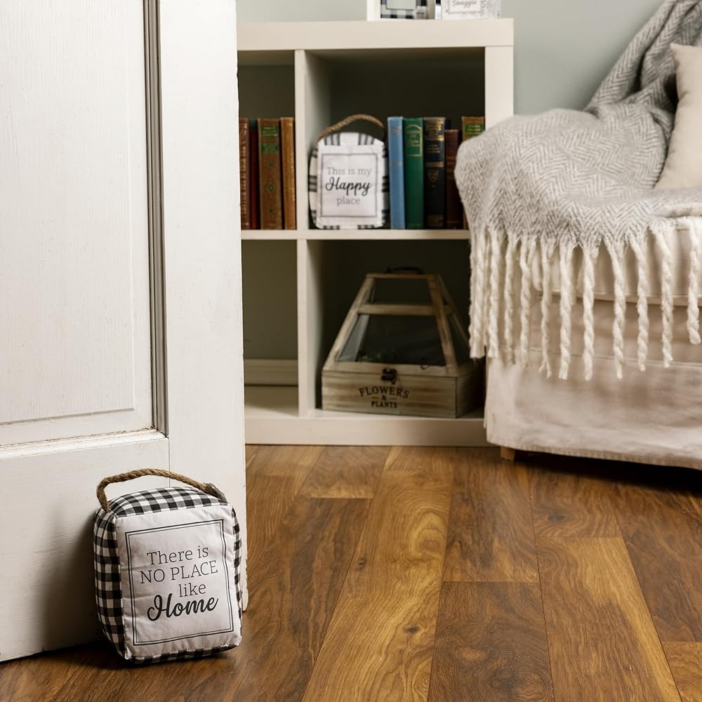 The "There's No Place Like Home" Door Stopper and Book End by Pavilion is a premium-quality home decor item measuring 5" long, 4" wide, and 6" tall. Its exterior is crafted from a blend of 95% polyester and 5% linen and features an attached twisted jute rope handle, making it both stylish and functional. The interior is filled with a combination of polyester and sand at the bottom, giving it a weight of approximately 2 pounds. The door stopper is adorned with a white and gray checkered pattern on the bottom, top, sides, and back, adding a touch of rustic farmhouse charm to any home. The front showcases a dark gray double-lined framing with the sentiment "There Is No Place Like Home." This versatile piece can also double as a bookend or be placed behind a door to prevent damage to walls or in front to keep the door propped open. It makes for an excellent housewarming gift for new homeowners or a lovely addition to an existing home's decor. Maintenance is easy with spot cleaning and sun drying. The door stopper comes packaged with a hangtag inside a plastic polybag and is designed to hold open lightweight wooden or manufactured doors, excluding heavy or spring-loaded ones. Pavilion offers a range of door stoppers and farmhouse-style decor, catering to various gifting needs and home decor preferences.