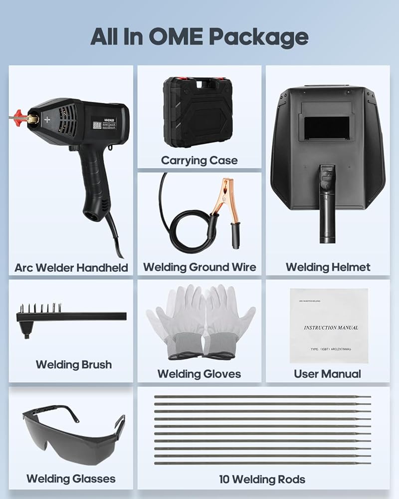 • 【مجموعة أدوات اللحام الكاملة】 آلة اللحام المحمولة مع الكثير من الملحقات والأدوات ، آلة لحام 1 × ممسك ، سلك أرضي لحام 1 × ، خوذة لحام 1 × ، فرشاة لحام 1 × ، 1 × قفازات لحام 1 × ، 1 X دليل المستخدم ، قضبان اللحام 10 × ، نظارات لحام 1 ×.