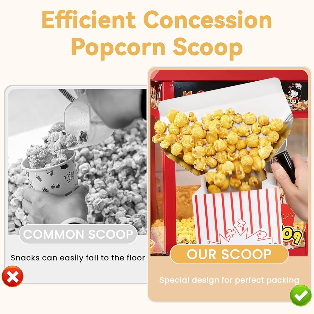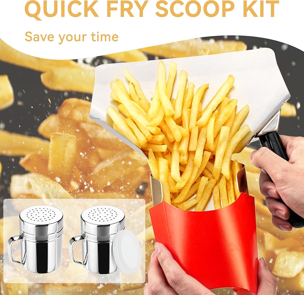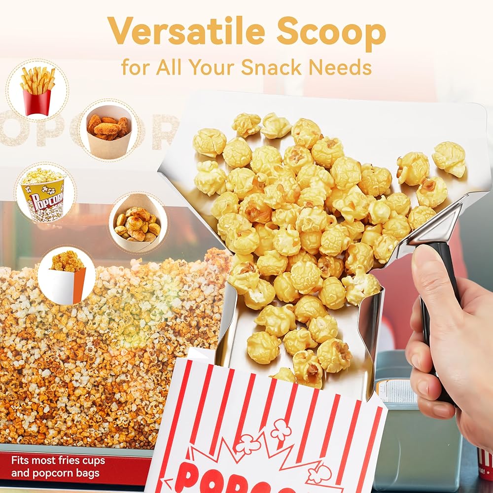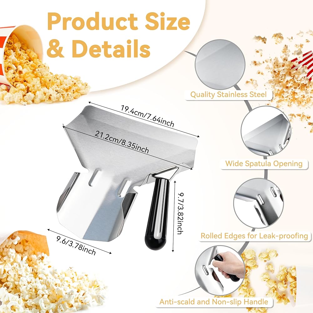 Versatile Tools for Snacks Enhance your serving experience with this popcorn machine scoop and small popcorn scoop, perfect for popcorn, French fries, and other hot or cold snacks. The ergonomic design ensures precision and comfort while reducing spills. Durable and Reliable Materials Made with premium stainless steel and aluminum, these popcorn machine supplies are built to last. The popcorn salt shaker and scoops are sturdy, rust-resistant, and safe for long-term use, providing exceptional performance. Comprehensive Popcorn Accessories This popcorn kit includes a french fry scoop and two popcorn salt shakers, offering everything you need for serving snacks efficiently. The bundle is ideal for homes, concession stands, and restaurants. Practical and Convenient Design The anti-slip handle and carefully polished edges ensure the popcorn machine scoop and french fry scoop are easy and safe to use. Their practical design minimizes mess, allowing you to fill bags, bowls, or boxes neatly. Wide Applications Suitable for both wet and dry products, these popcorn accessories can handle popcorn, snacks, sugar, coffee, pet food, and more. Their versatility makes them indispensable for any kitchen or event. Perfect for Various Settings This popcorn kit is ideal for parties, movie nights, or commercial use. Whether at concession stands or in the comfort of your home, these popcorn machine supplies ensure quick and efficient preparation and serving.