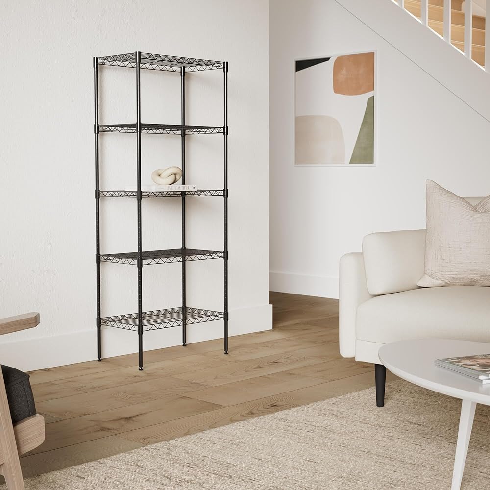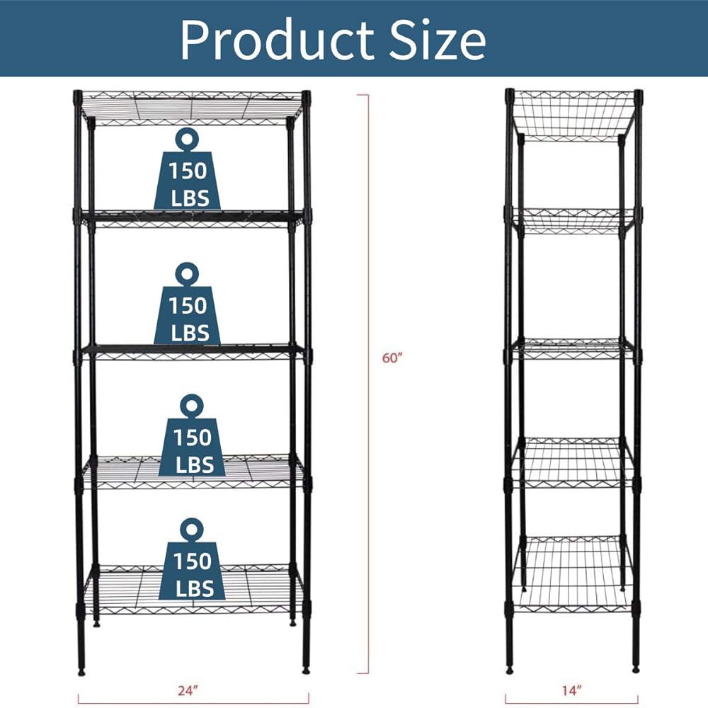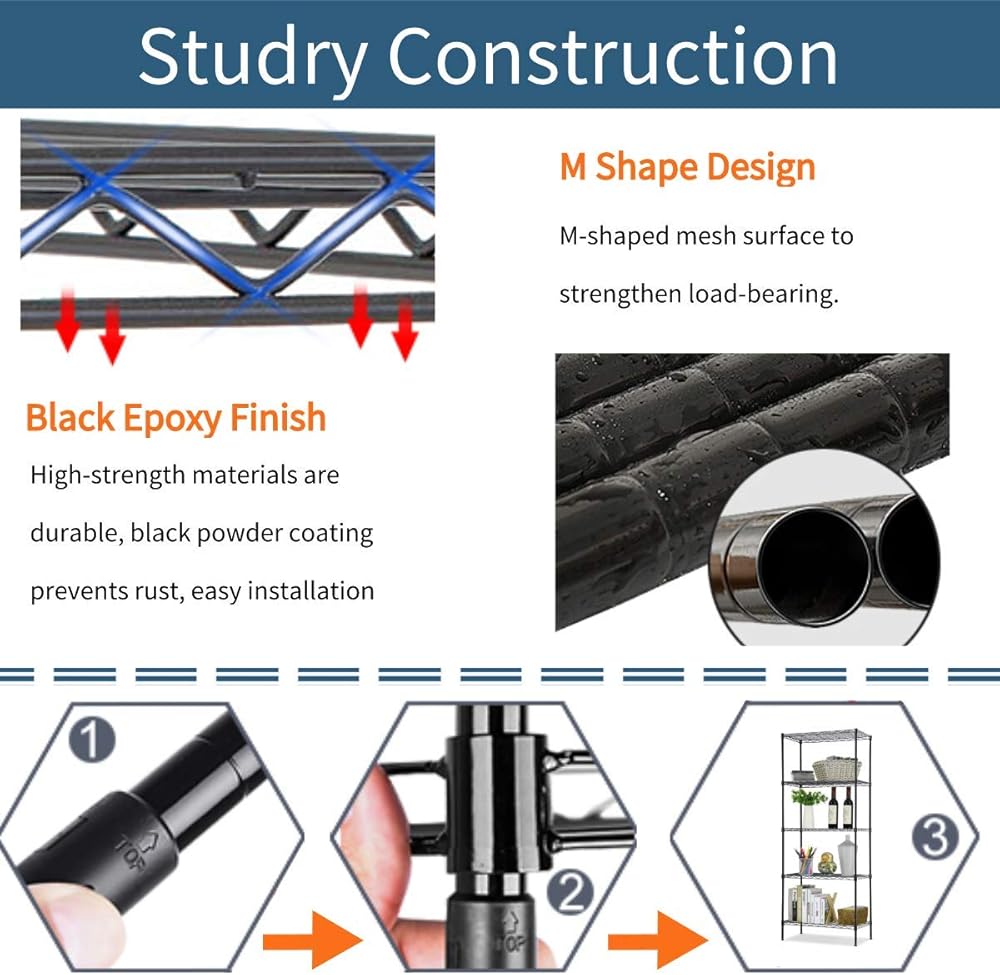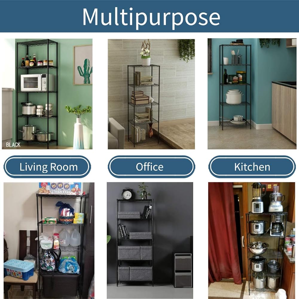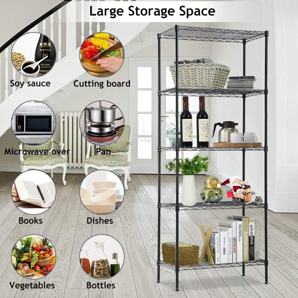 • 【DURABLE & LARGE STORAGE】 The 5-tier shelving unit is especially black coating-plated finish for protecting it from water, rust or corrosion and making it easy to clean. The wire shelving unit have a lot of room for storage. Tools, books, clothes, bag, small appliances, kitchen suppliesand or anything you'd like to keep organized and accessible can be placed on this storage shelves. The metal shelf doesn't occupy too much space, but it can create more additional space.