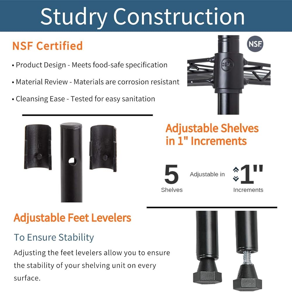• 【RELIABLE & STURDY CONSTRUCTION】 The wire shelving unit use durable steel construction offers remarkable strength, convenience, and versatility. Each shelf holds up to 150 lbs, total max load weight is 750 lbs (evenly distributed weight). Equipped with 4 leveling feet to keep the wire shelving unit in place and allow you to balance and stabilize it, accounting for any unevenness on the floor.
