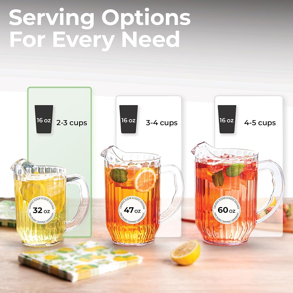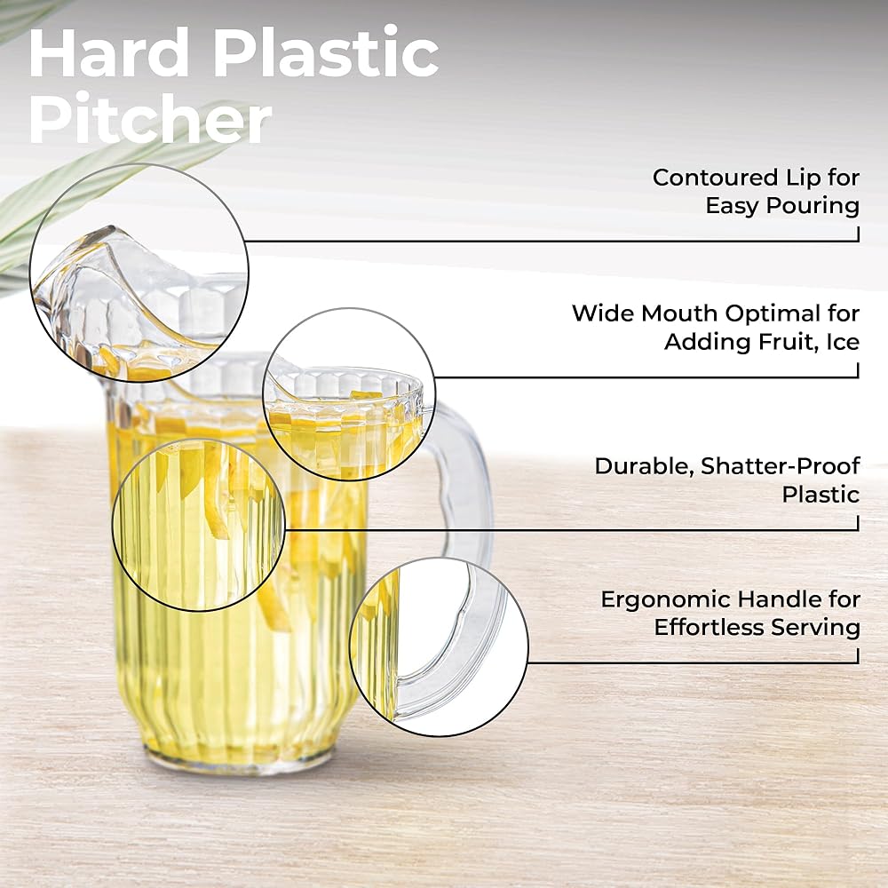 ERGONOMIC GRIP FOR ADDED COMFORT: This plastic pitcher is designed with a specially molded handle and ergonomic grip to make it easier and more comfortable to carry and pour drinks.