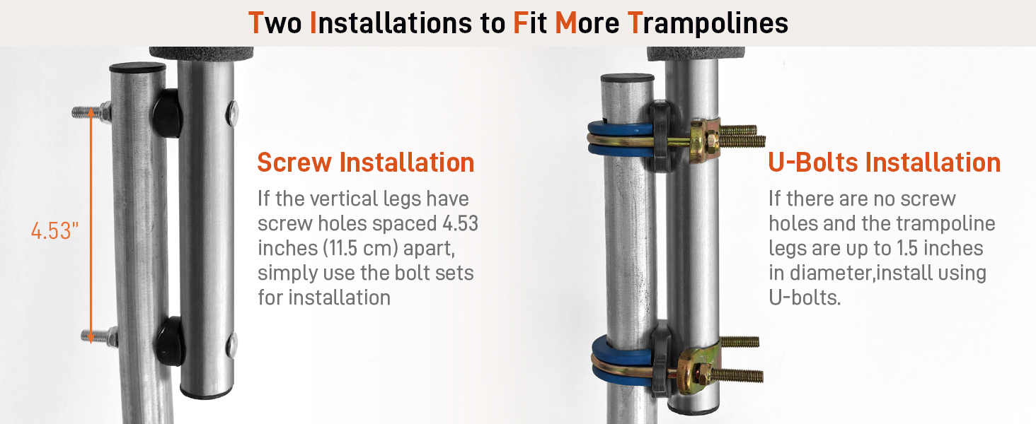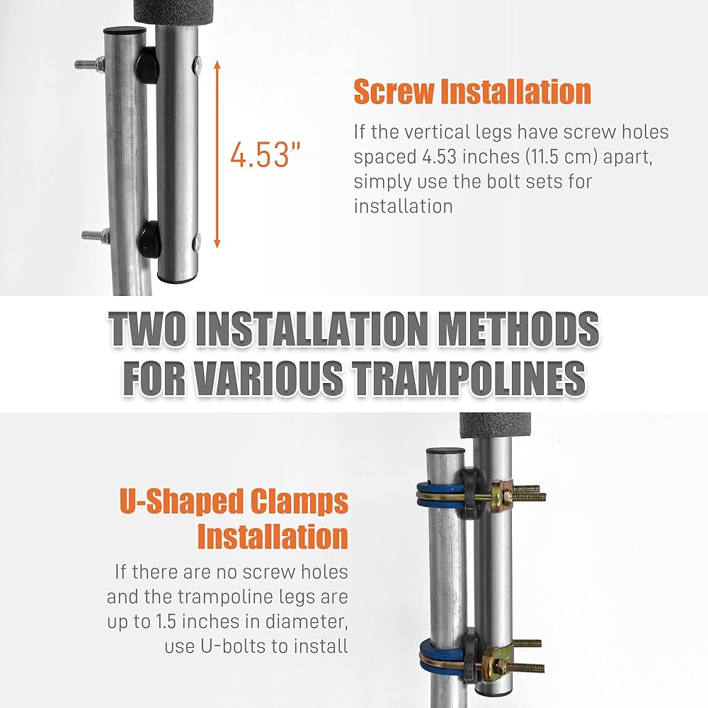 【خياران سهلان للتركيب】يأتي استبدال أعمدة الترامبولين لدينا مع خيارين للتركيب لتناسب تصميمات الترامبولين المختلفة. بالنسبة للترامبولين مع فتحات براغي موجودة متباعدة 4.53 بوصة (11.5 سم)، استخدم البراغي المتضمنة مع وسادات مضادة للانزلاق لتأمين الأعمدة. بالنسبة للترامبولين بدون فتحات لولبية، استخدم البراغي على شكل حرف U والوسادات المضادة للانزلاق للتثبيت الآمن. تسمح هذه المرونة بالإعداد السريع والاتصال الآمن والمستقر.
