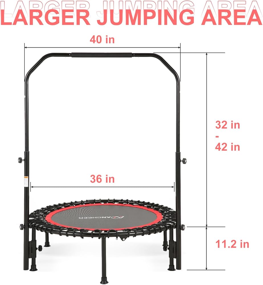 • سطح الترامبولين للغاية بحجم 40 بوصة: يتميز الترامبولين الداخلي المرساة بحجم كبير بحجم 40 بوصة ، مما يوفر مساحة واسعة للمتعة التي لا نهاية لها. يضمن بناءها المتين والقوي التمتع لفترة طويلة بالنسبة لك ، مع القدرة على تحمل ساعات القفز واللعب.