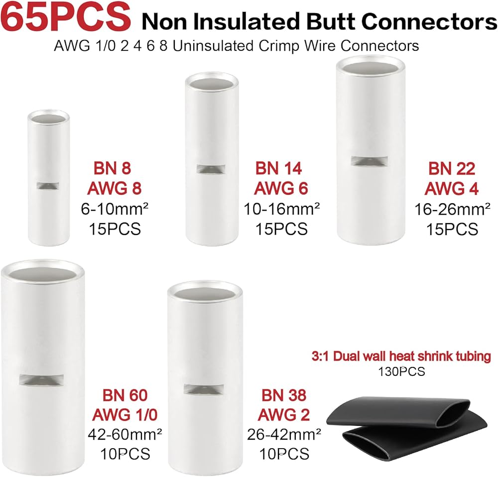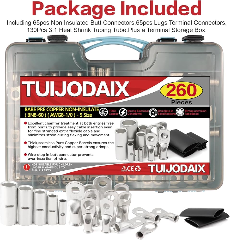 260pcs BN8-BN60 موصلات بعقب غير معزولة و AWG 1/0 2 4 6 8 طقم موصل كبل البطارية المعلب ، و 65pcs موصلات سلكية تجعيد غير معزولة ، و 65pcs terminal lugs و 130pcs تقلص الحرارة أنابيب الحرارة
