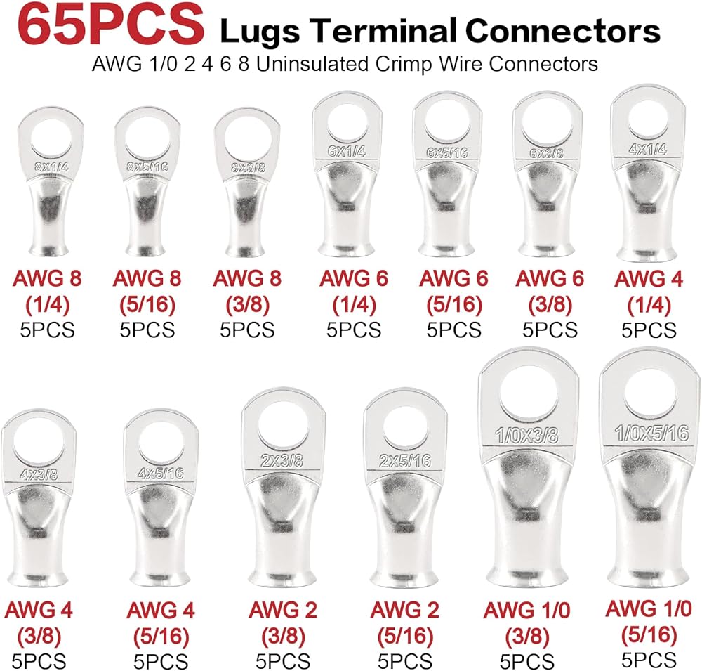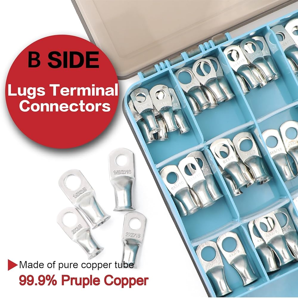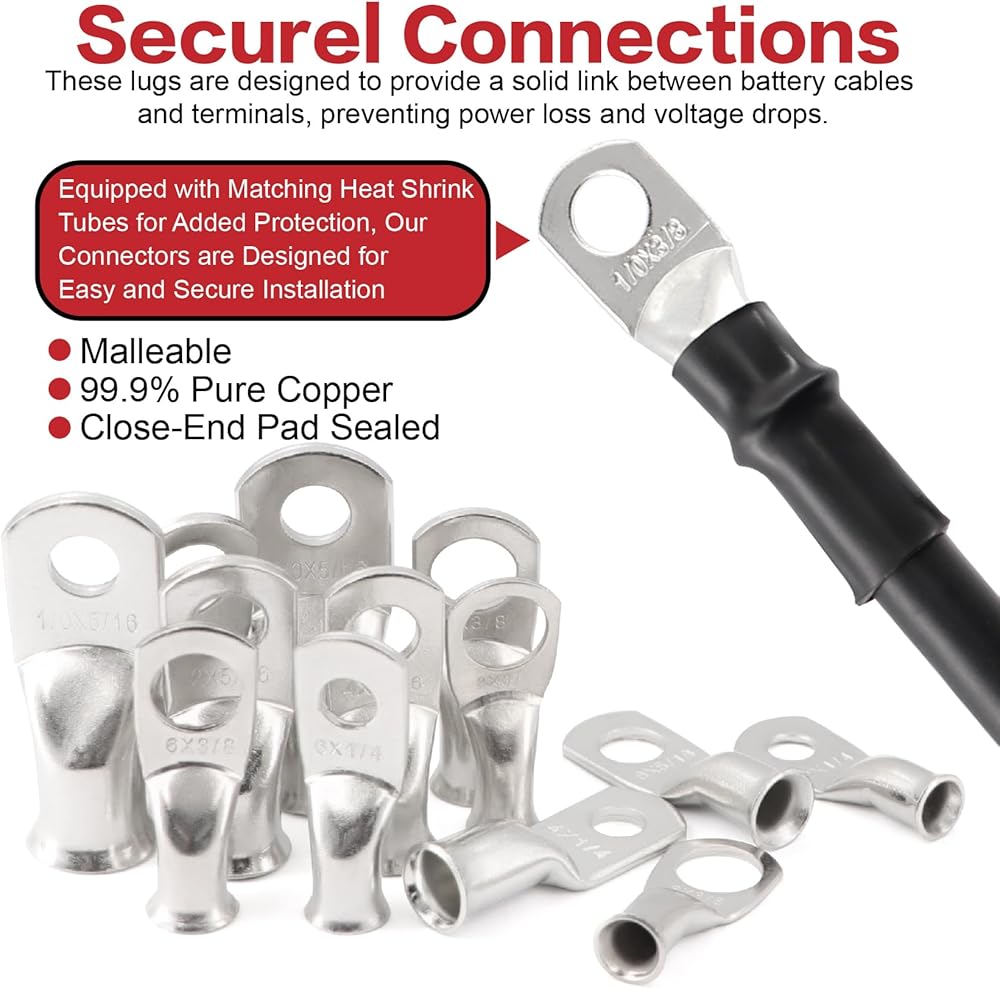【التثبيت السهل】 تأتي موصلات طرف البطارية بحجم عالمي تلتزم بالمعايير الأمريكية. يؤدي فتحة الانهيار إلى تسهيل إدخال سلك سهلة ويضمن أنه لا يمكن أن يسقط من العروات النحاسية بعد العقص أو اللحام ، مما يضمن اتصالًا آمنًا وصخريًا.