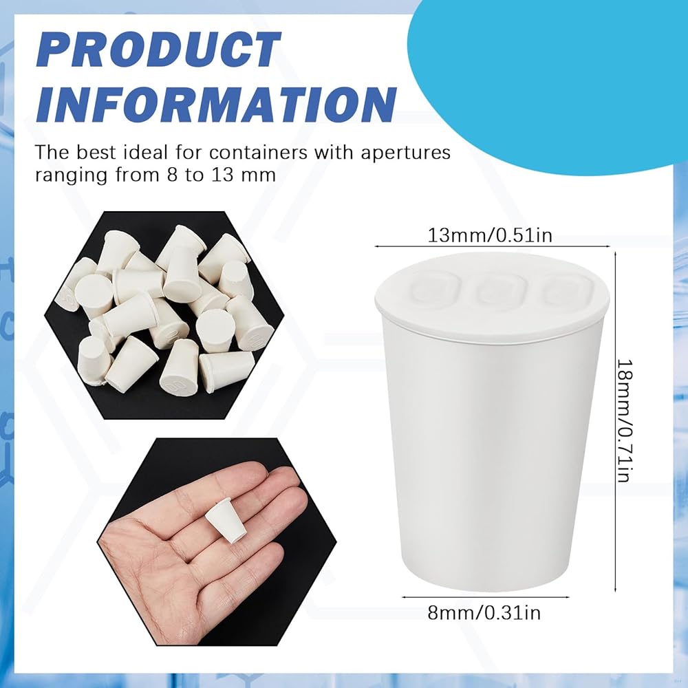 Suitable Size: each rubber stopper measures approximately 0.4 x 0.6 x 0.8 inches, with a bottom diameter of 11 mm, top diameter of 15 mm, and main body height of 20 mm; These sizes make them ideal for containers with apertures ranging from 11 to 15 mm
