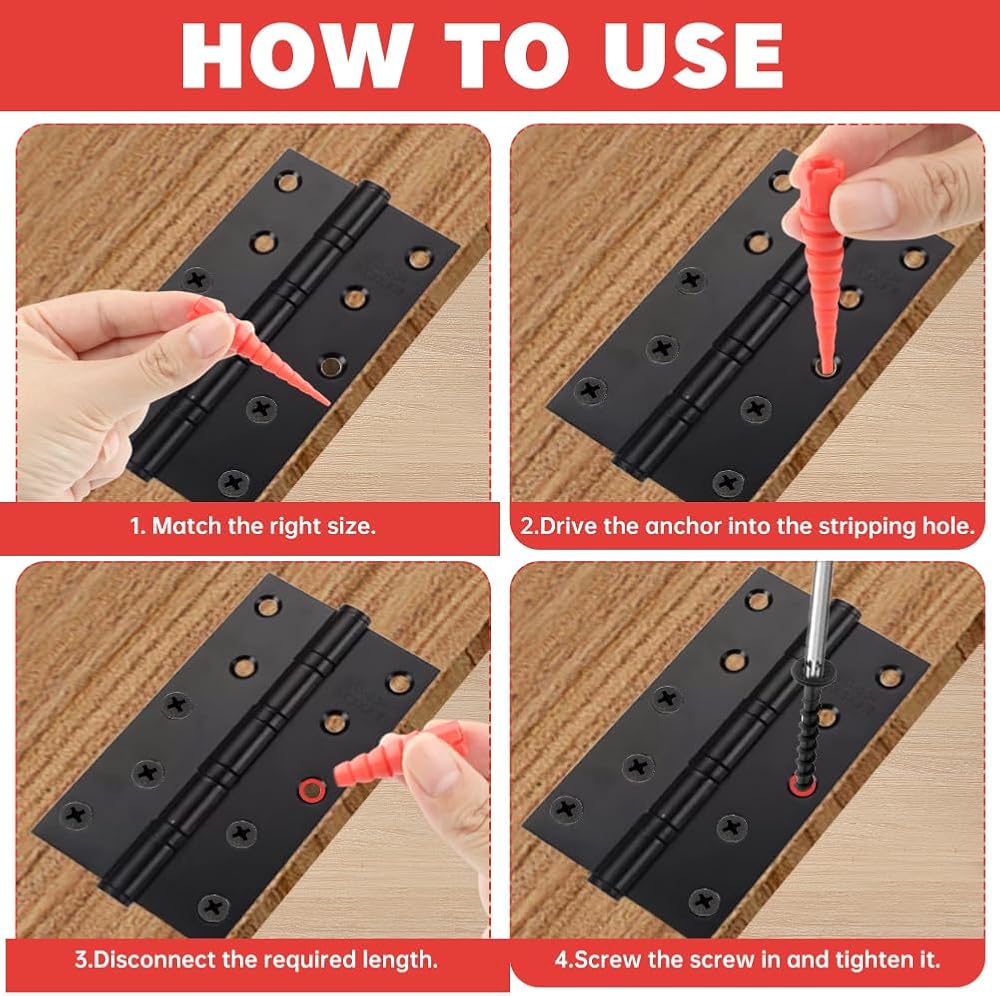 【Easy to Install】Drywall anchors repair stripped and worn wood screw holes in less than a minute; 1; Simply match the anchor to the appropriate screw size; 2; Screw the anchor into the existing hole 3; Break the anchor at the desired length 4; Use existing screws.