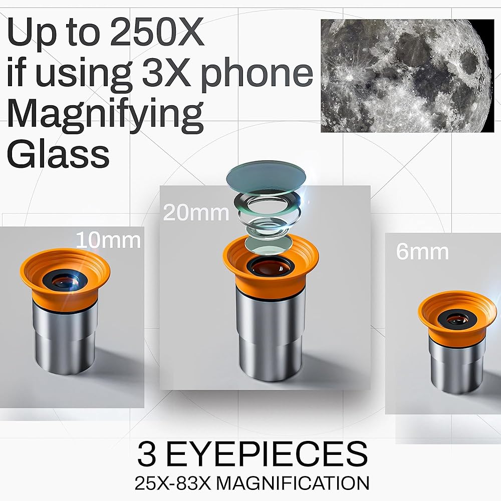تعميم العلوم التعليمية: مطابقة 3 عدسات عينية، 6 مم، 10 مم، 20 مم، مناسبة لسيناريوهات الاستخدام المختلفة، أو تسجيل جمال الأرض أو استكشاف الكون حسب الرغبة. يأتي مع أدلة استخدام مفصلة، مناسبة للمبتدئين والطلاب للتعلم وتحفيز اهتمامهم باستكشاف الفضاء باستخدام التلسكوب الذكي