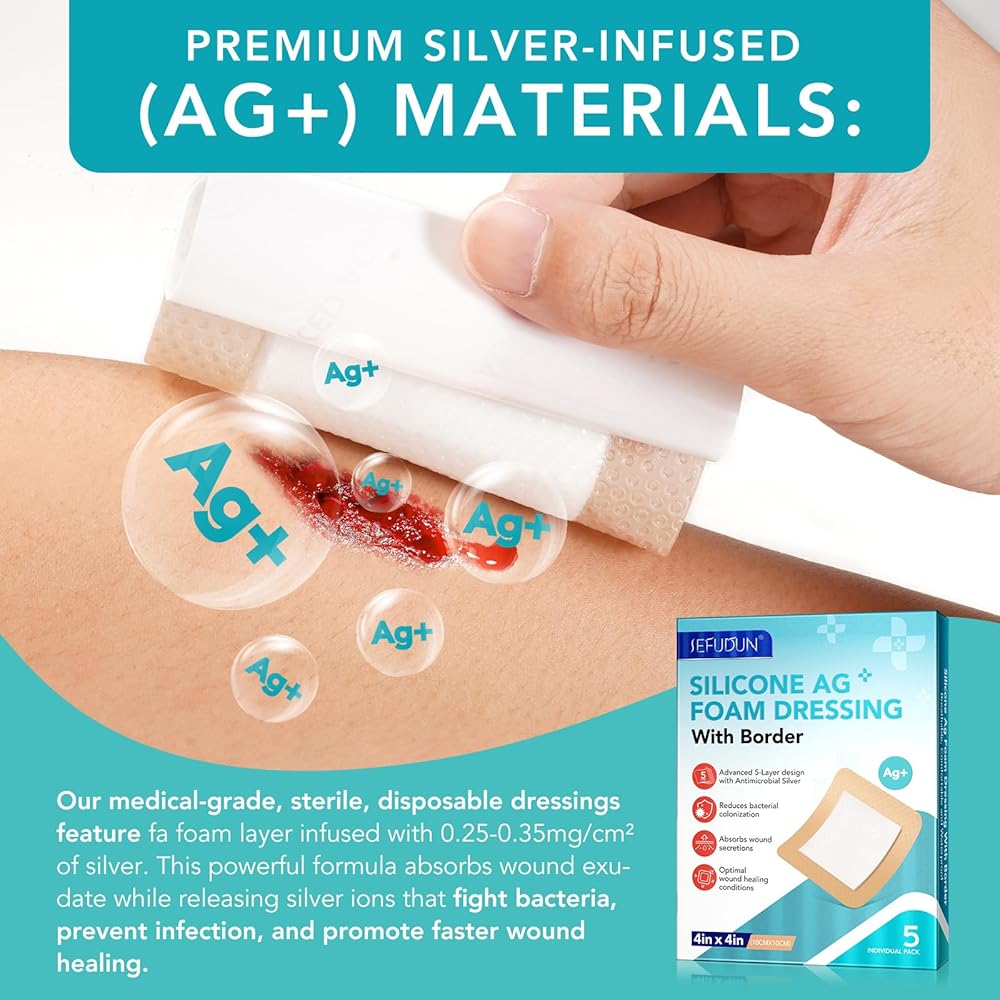 الفضة الممتازة المملوءة: خلع الملابس الرغوة السيليكون AG مع 0.25-0.35 ملغ من الفضة أيون لكل مربع. يمكن أن يمتص بشكل فعال الإفرازات الجرحى ، ويوفر حماية قوية مضادة للبكتيريا لمدة تصل إلى 7 أيام. يعزز الظروف المثلى لشفاء الجروح ، ويقلل من مخاطر العدوى ، وتهدئة البشرة الحساسة