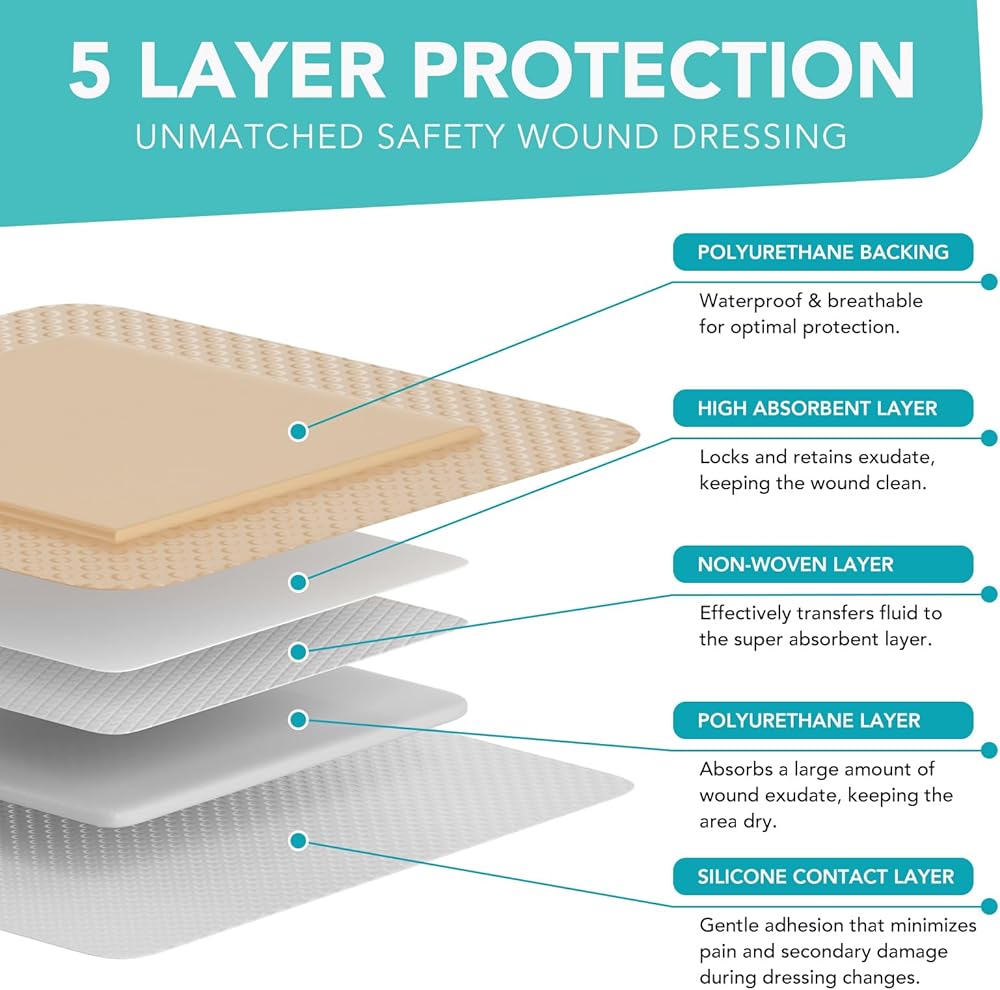 5 طبقة حماية: يمكن أن تمتص الضمادات المتقدمة ذات الطبقات ذاتية الطبقة ذاتية ما يصل إلى 15 مرة من السائل الجرح ، ويحافظ على بيئة رطبة صحية. أثناء تشكيل سطح ماصة ولكنه قابل للتنفس ، فإن ذلك يبقي الجرح رطبة ويشفي بشكل أسرع. دع أولئك الذين يصعب عليهم ارتداء المنطقة بسهولة