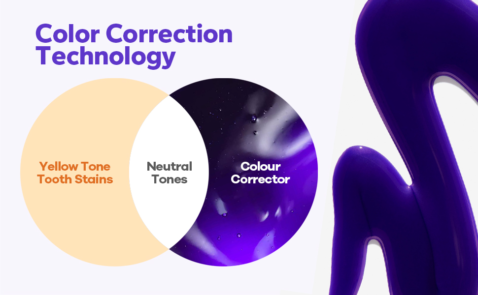 تقنية تصحيح الألوان: يستخدم معجون الأسنان الأرجواني لتبييض الأسنان تقنية تصحيح الألوان ، حيث يكون اللون الأرجواني عكس اللون الأصفر مباشرة على عجلة الألوان ، مما يجعله لونه التكميلي. يمكن أن تحيد النغمة الأرجواني في معجون الأسنان التبييض لدينا اللون الأساسي الأصفر ، واستعادة السطوع ، وتحييد البقع ، والأسنان البيضاء.