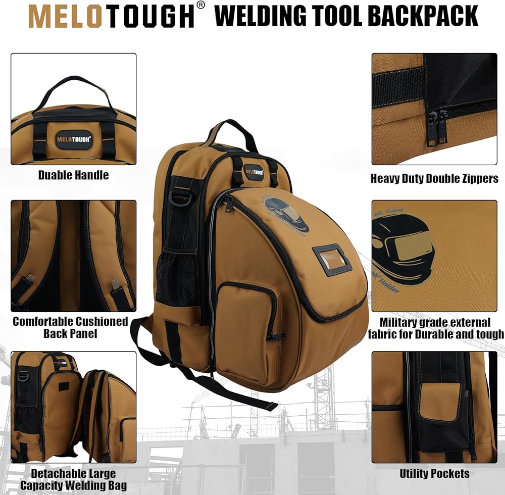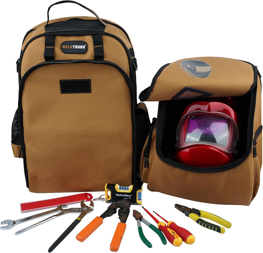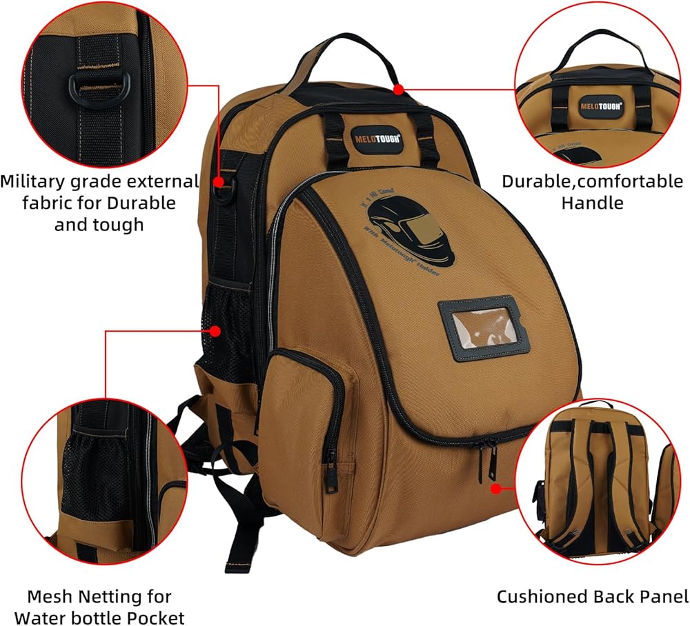 حقيبة ظهر للأدوات لحام Melotough للأدوات وحزمة التروس المتطرفة مع خوذة مع حقيبة تخزين لأمتعة حقيبة لحام لحام السعة (بنية)