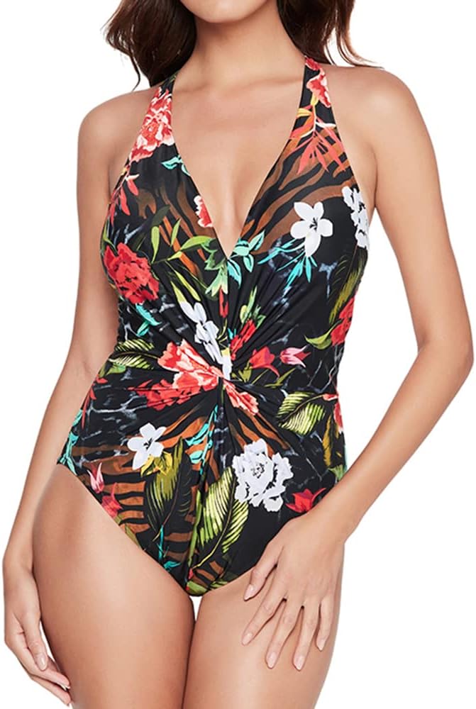 MAGITEX® fabric provides all over slimming control. Plunging V-neckline with removable soft cups. The twist front detail helps camouflage midsection and creates a flattering hourglass illusion.