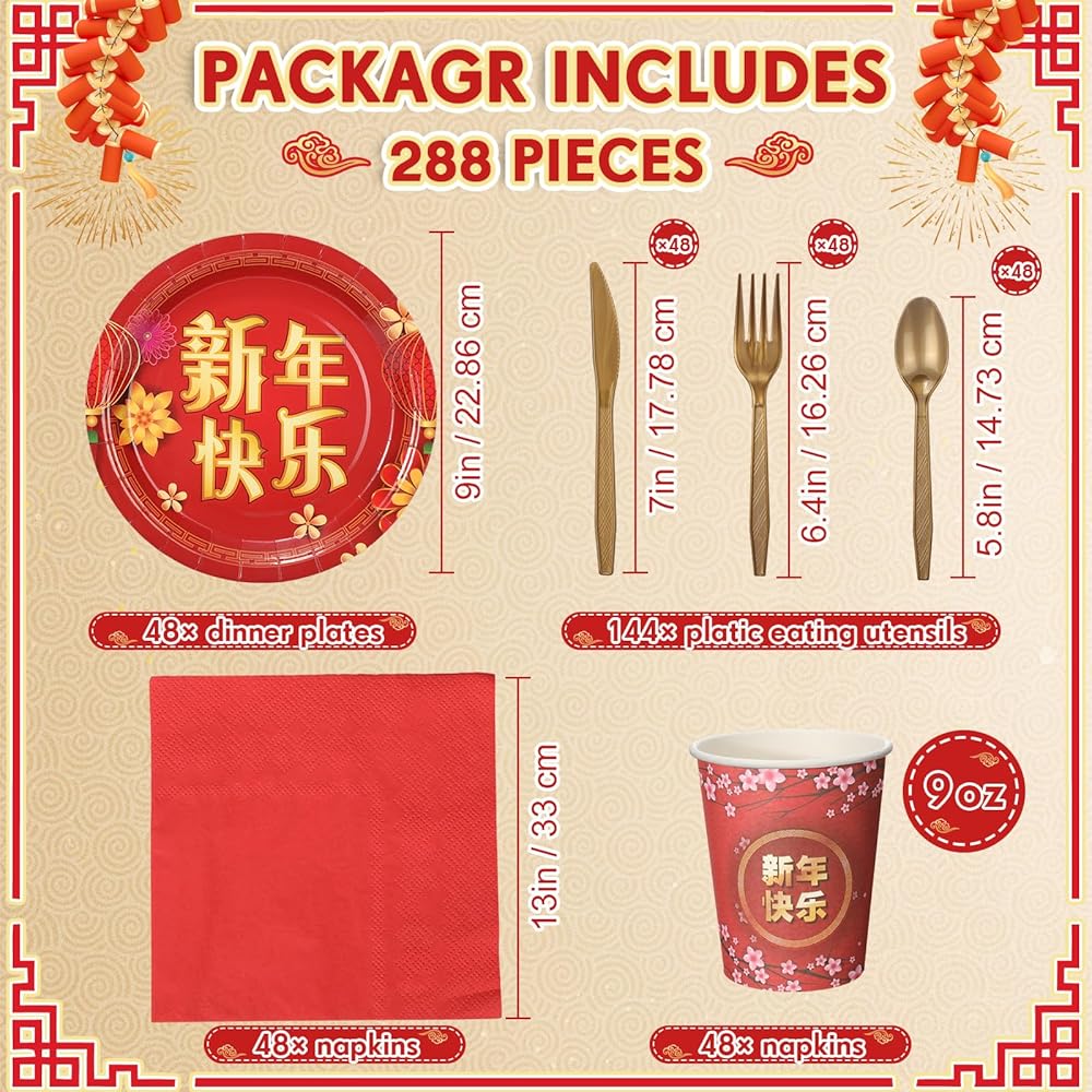 • Serve 48 Guests: there are 288 pieces of Chinese New Year party supplies, including 48 pieces of 9 inch paper plates, 48 pieces of 9 oz paper cups, 48 pieces of paper napkins, 48 pieces of spoons, 48 pieces of forks, 48 pieces of knives, sufficient quantities and diverse styles can meet your party serving needs