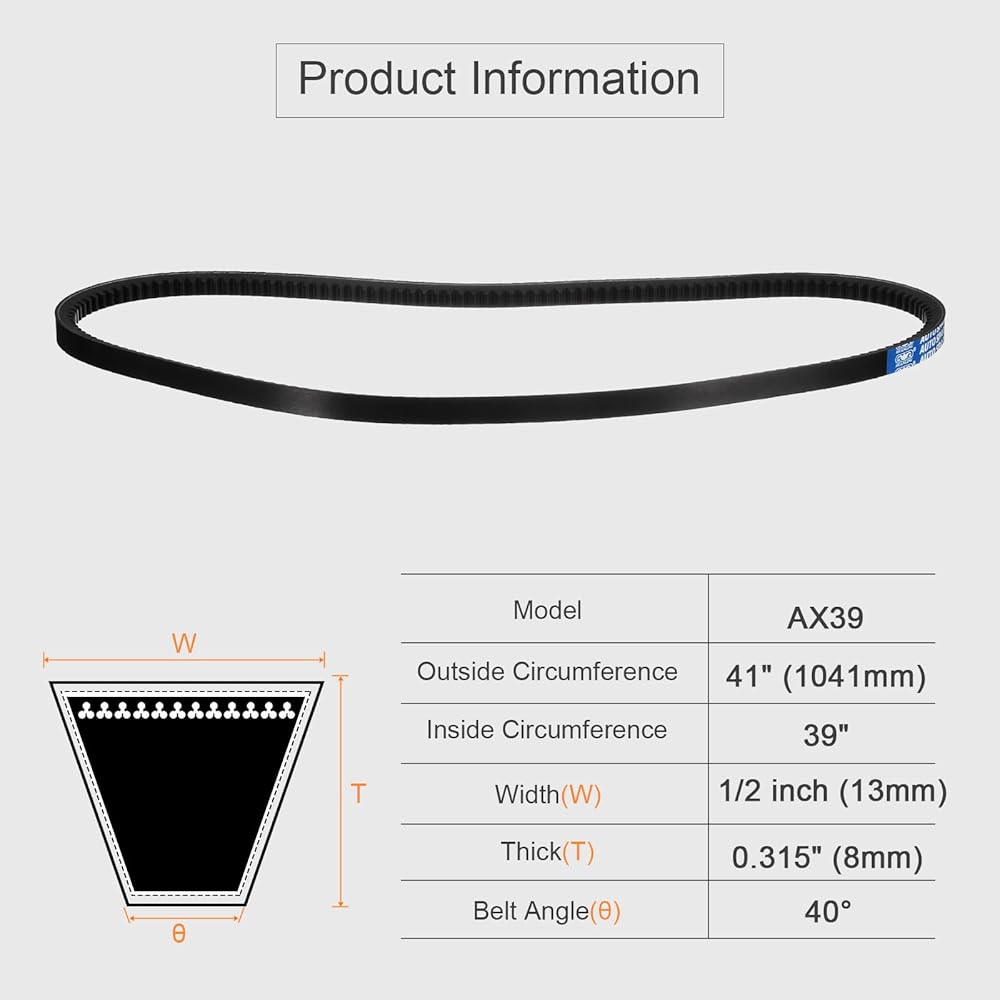 الحجم - AX39 COGLAGED V -BELT ، محيط داخلي: 39 بوصة × محيط خارجي: 41 بوصة (1041 مم) عرض: 1/2 بوصة (13 مم) x السماكة: 0.315 بوصة (8 مم)