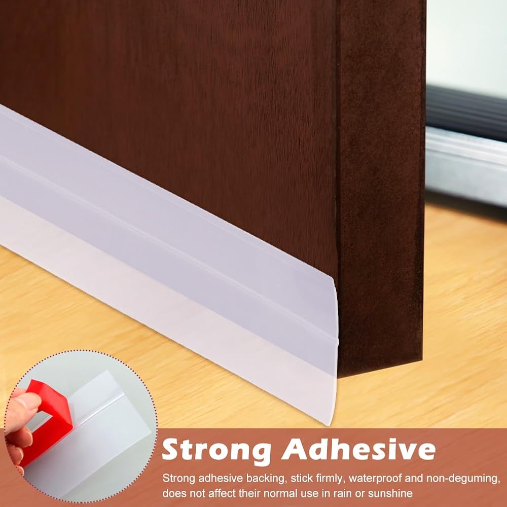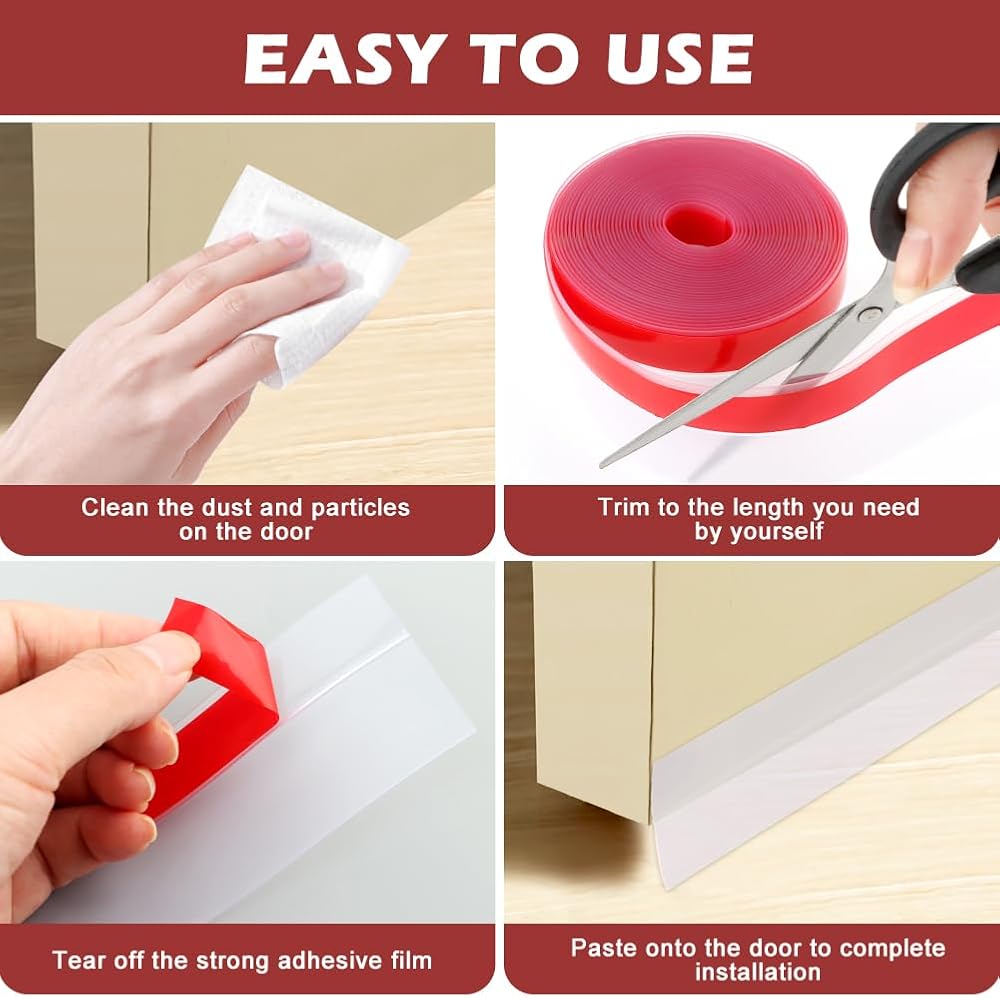 【EASY TO USE】Wipe the bottom of the door clean with a dry rag. Place the sealing strip at the bottom of the door, touch the ground lightly, adjust the height and length, and make a mark. Use a tool to cut off the long part. Tear off the adhesive protective paper, press the door against the mark and flatten it. After installation, press the sealing strip tightly with your hands, and you're done!
