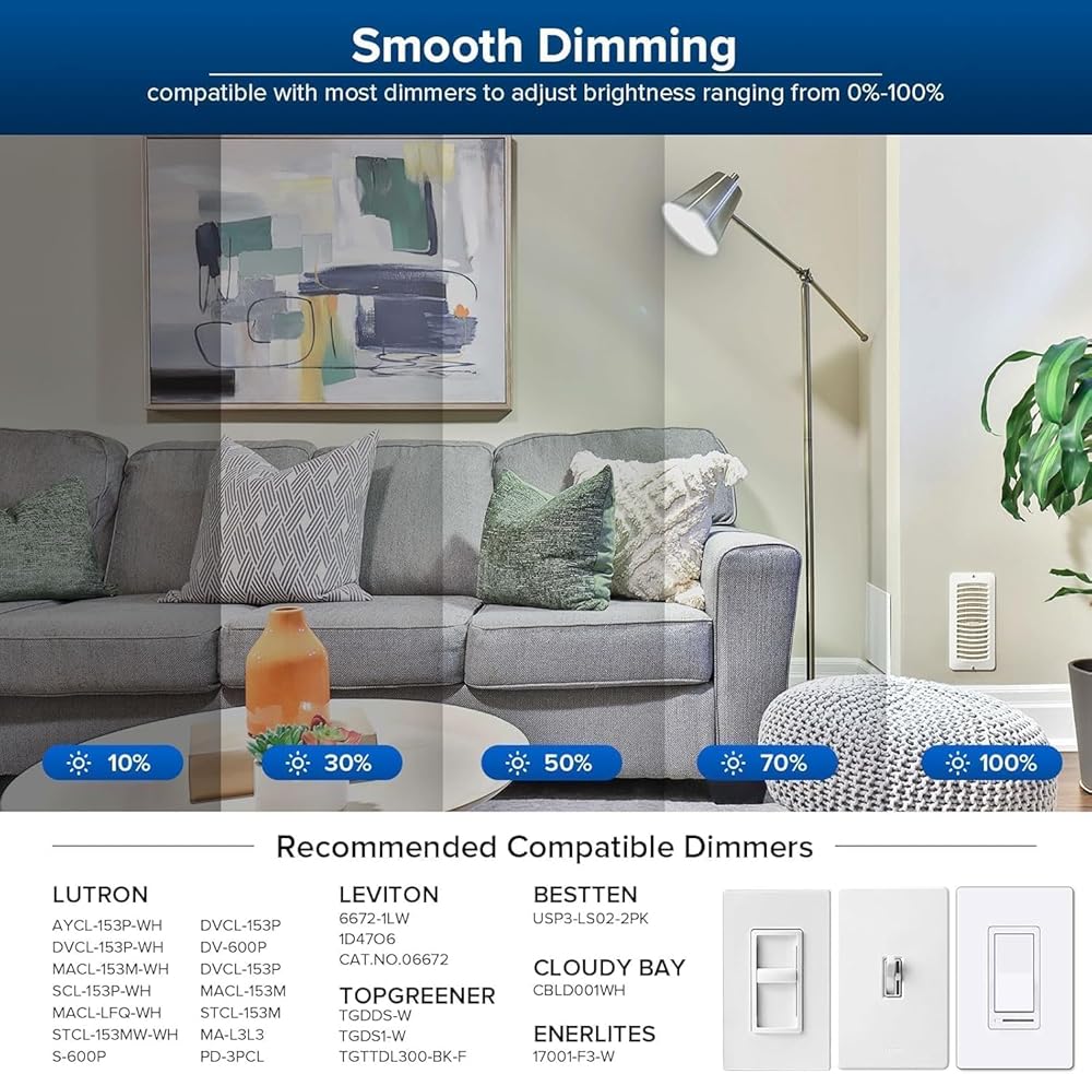3000K Dimmable: يقدم مصباح LED الأبيض Sansi الناعم 3000k ناعمًا من 0 إلى 100 وهو متوافق مع Dimmers Triac. من السهل عليك ضبط سطوع الضوء وخلق جو مثالي في أي وقت ، مثالي للمطبخ وغرفة المعيشة وغرفة النوم والإضاءة التجارية