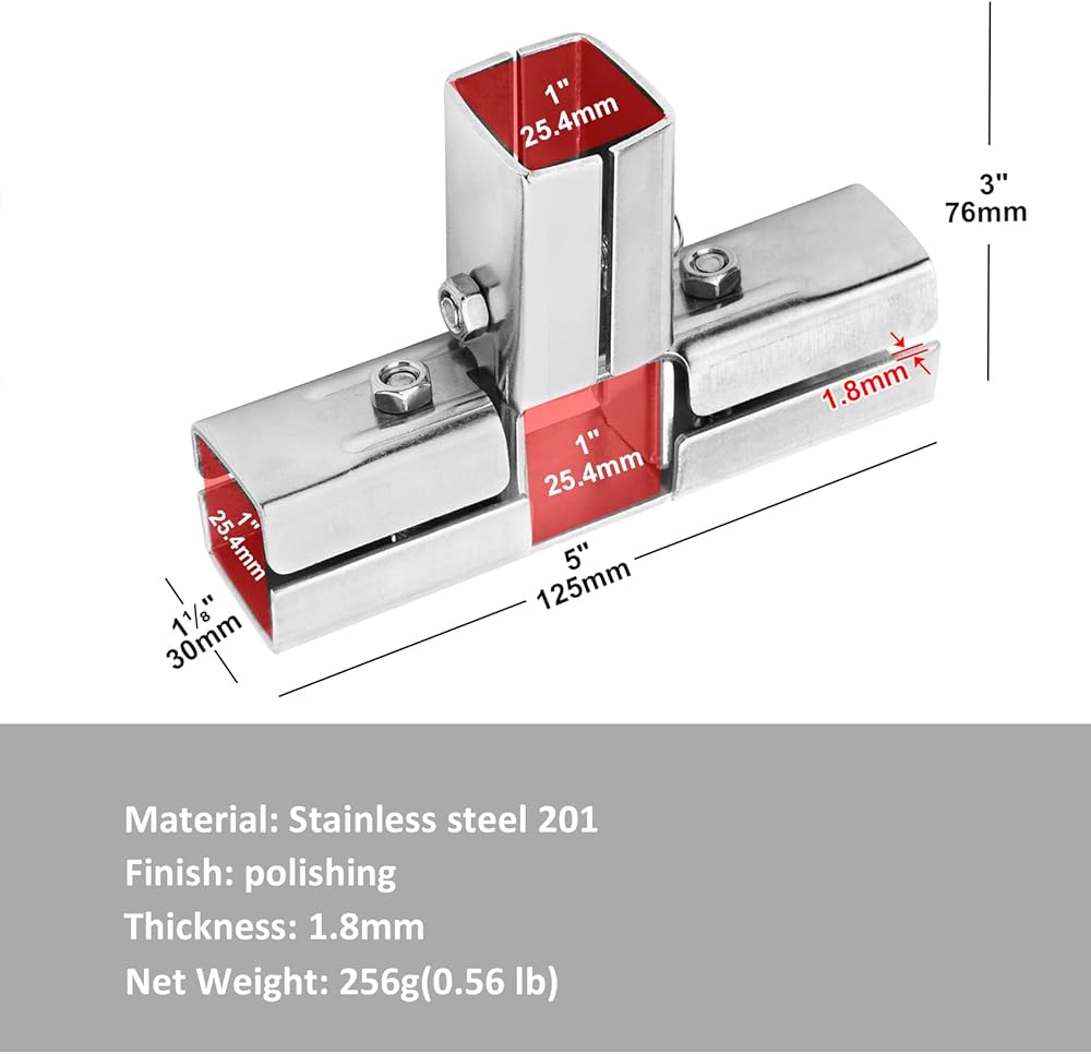 6 PCS 1 "موصل أنبوب مربع ، 4 طرق T تقسيم أنبوب مربع ، الفولاذ المقاوم للصدأ