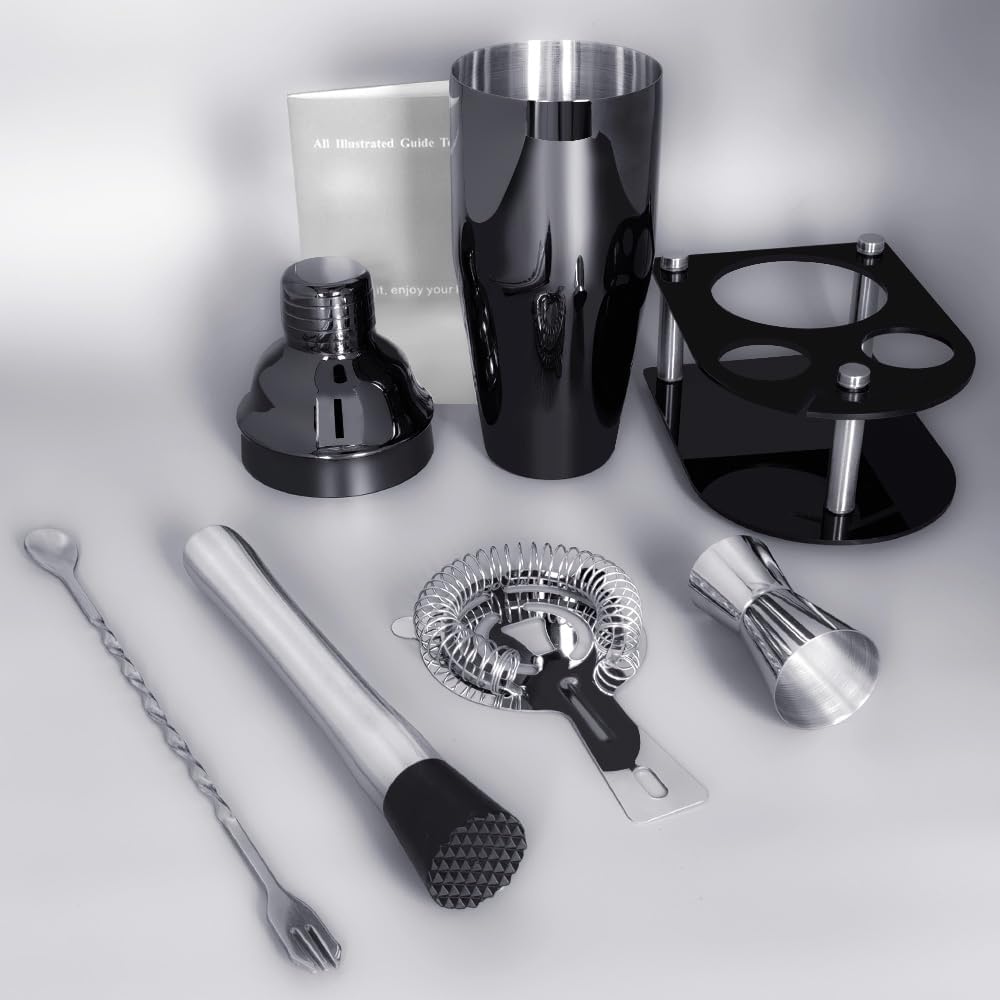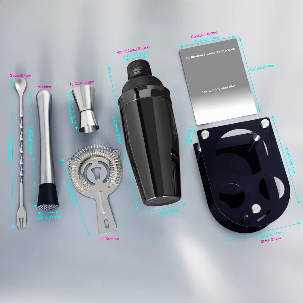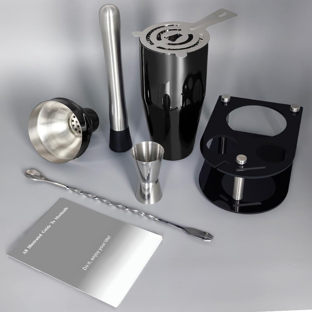 Elevate your home bartending skills with this premium 5-piece cocktail shaker set. Crafted from high-quality stainless steel, this bartender kit includes a sleek 25 oz cocktail shaker, a strainer, a 15/30ml jigger for measurements, a long spiral bar spoon for seamless mixing, and a sturdy muddler for crushing fruits and herbs. With a stylish stand for convenient storage, this set offers everything you need to create professional-grade cocktails right at home. Impress your guests with perfectly chilled martinis, refreshing mojitos, or any other libation you desire. The leak-proof design ensures mess-free mixing, while the durable construction promises years of reliable use. Upgrade your bar accessories and unlock a world of delicious drinks with this versatile cocktail shaker set.