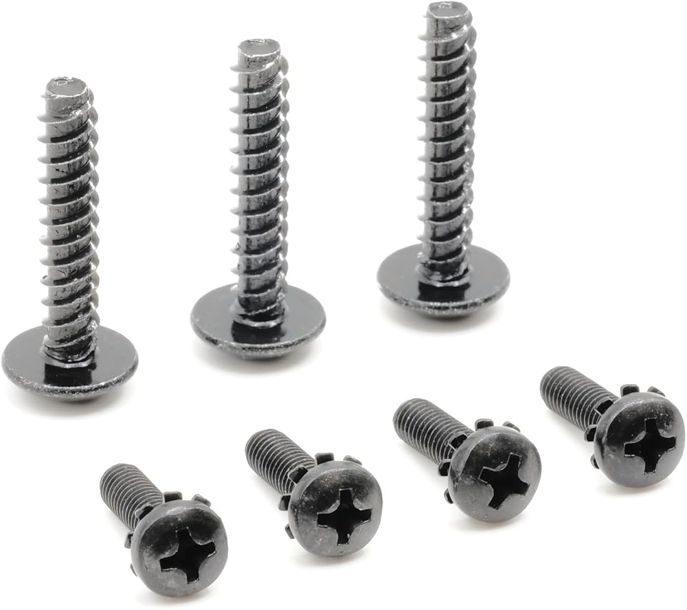 Two sets of metric screws, seven screws in total. Four short black machine screws and three long black self-tapping screws.