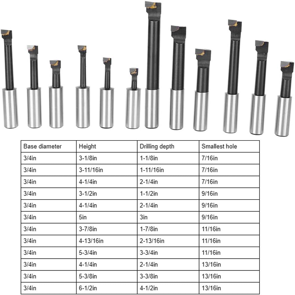 Base diameterHeightDrilling depthSmallest hole3/4in3-1/8in1-1/8in7/16in3/4in3-11/16in1-11/16in7/16in3/4in4-1/4in2-1/4in7/16in3/4in3-1/2in1-1/2in9/16in3/4in4-1/4in2-1/4in9/16in3/4in5in3in9/16in3/4in3-7/8in1-7/8in11/16in3/4in4-13/16in2-13/16in11/16in3/4in5-3/4in3-3/4in11/16in3/4in4-1/4in2-1/4in13/16in3/4in5-3/8in3-3/8in13/16in3/4in6-1/2in4-1/2in13/16in Package List:12 x Boring Bar