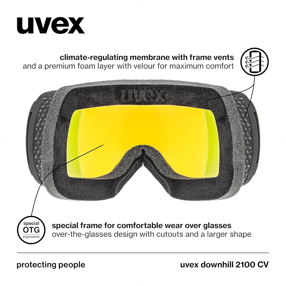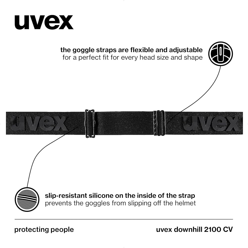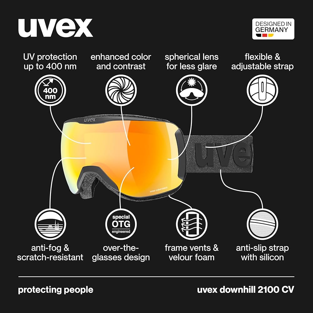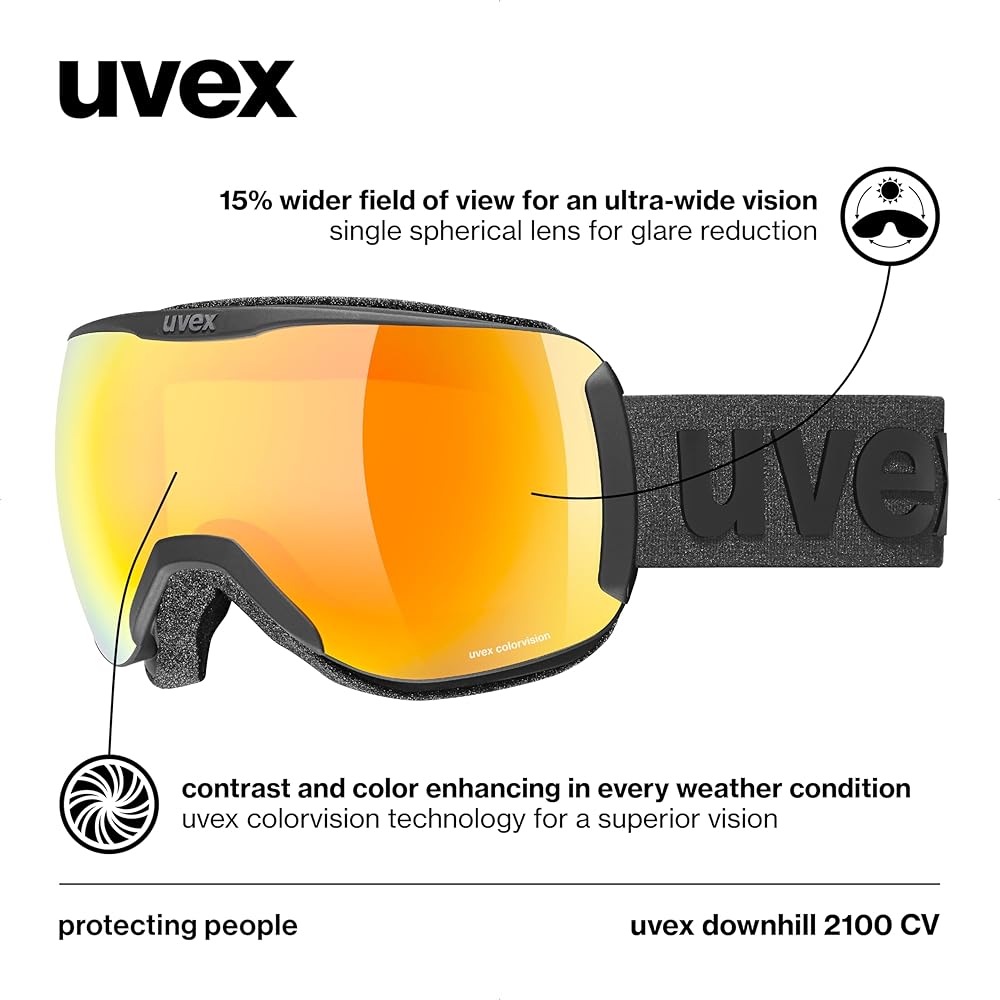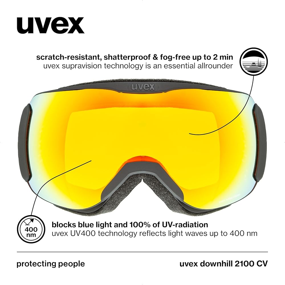 LENS TECHNOLOGIES: The uvex downhill 2100 CV features advanced lens technologies, including UV and blue light protection with uvex UV400 technology, scratch resistance, and fog prevention through uvex supravision technology, enhanced color and contrast with uvex colorvision technology, and less glare with a single spherical lens design.