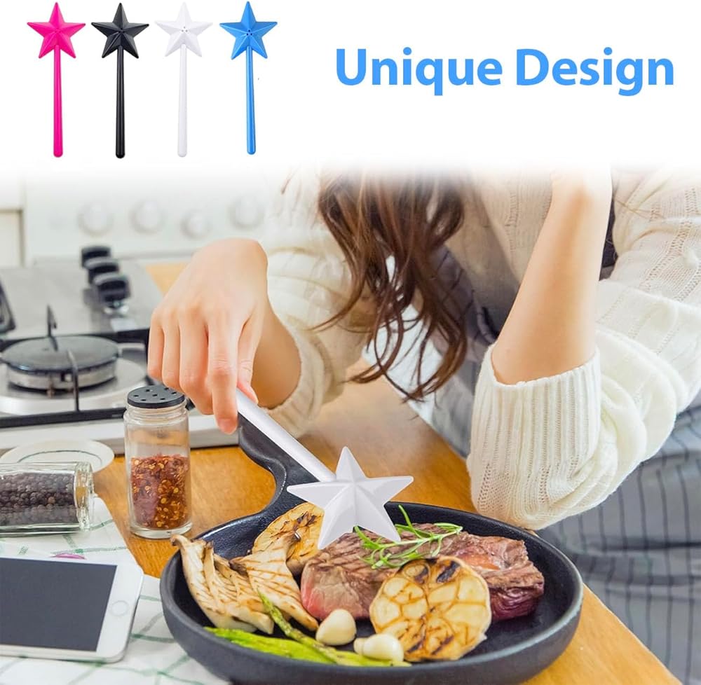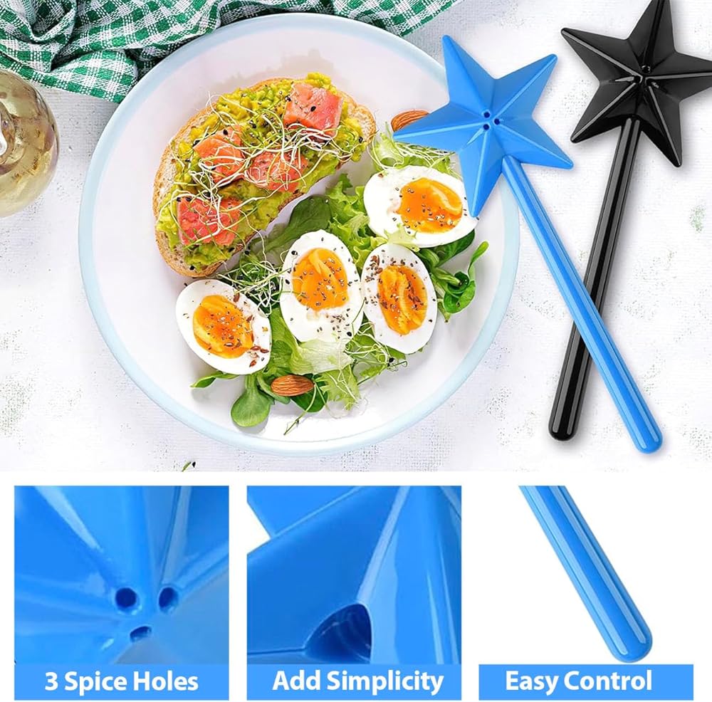 【Unique Design】Our salt and pepper shaker adopts star wand shape creative design, these designs can help you hold the salt and pepper shaker stick, making it more convenient and comfortable for you to use, the magic wand shaker has a small hole in the center , it can help us control the amount of seasoning more accurately.