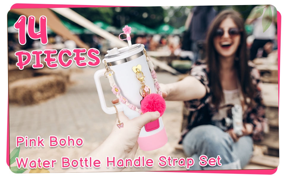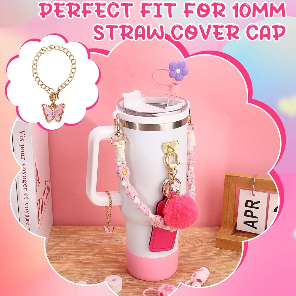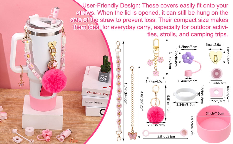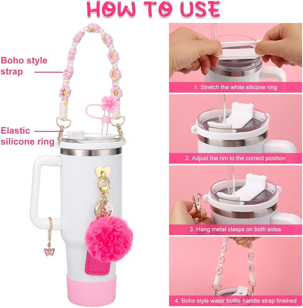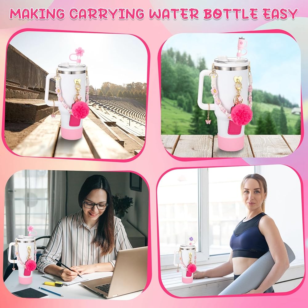 SUFFICIENT SET:Our pink for stanley cup accessories set contains 1 pcs water bottle handle strap,1 pcs spill stopper,1 pcs silicone boot,1 pcs chapstick holder,5 pcs charms for stanley and 3 pcs silicone straw cover for stanley cup