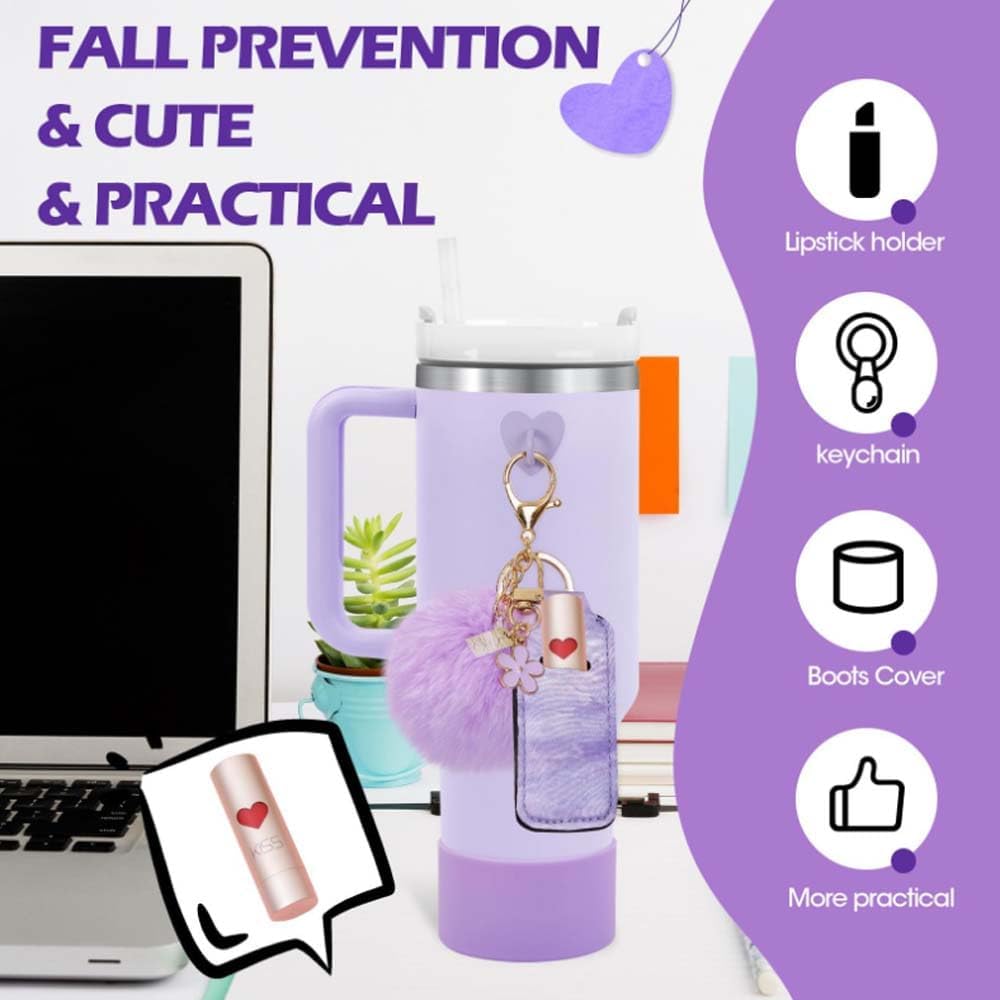 Set Include:1 water bottle boot, 1 keychain, 1 lipstick holder, 1 plush ball, 2 heart-shaped hooks.Which allow you to customize your Stanley Cup and show your unique style.