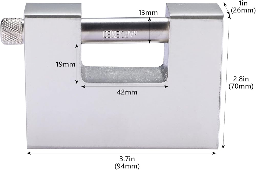 DIMENSIONS: Measuring 94mm x 70mm x 26mm ( 3.7" x 2.8" x 1"), Shackle Diameter: 13mm, Gap Size (Locked): L42mm x H19mm (1.65" x 0.75").