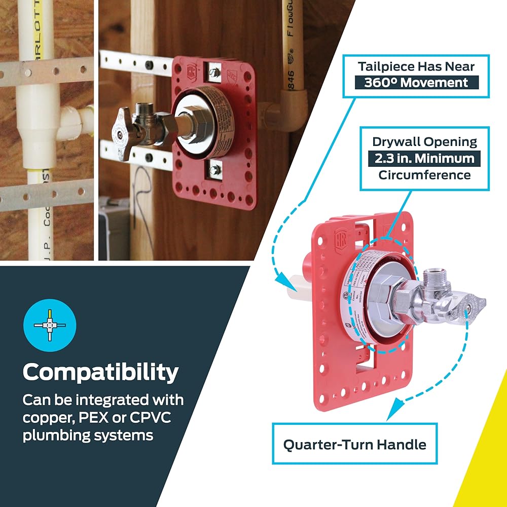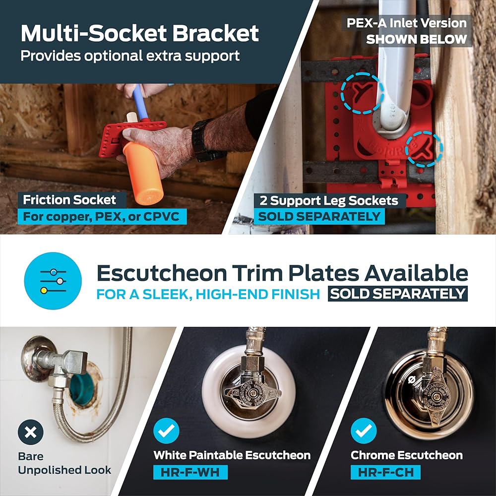 Simplify toilet or faucet installations with the Holdrite fixture outlet box, designed for quick setup of water supply valves in both residential and commercial projects. Pre-assembled for fast and hassle-free assembly, this valve box works with PEX pipe tailpieces that rotate nearly 360 degrees for flexible installation, and reduces total installation time compared to traditional methods. Each outlet box includes a supply valve with a quarter-turn handle, a 3/8 inch threaded compression connection, and a 1/2 inch tailpiece that comes pre-bent for easy connection; escutcheons and valve extensions are sold separately. Installation is straightforward, attaching directly to studs or between studs using a hyco bar or Holdrite brackets, and features a threaded debris cover that eliminates the need for adhesives, fasteners, or extra tools. This fire-rated fixture outlet box features a red base plate and is available with either white or chrome trim plates.