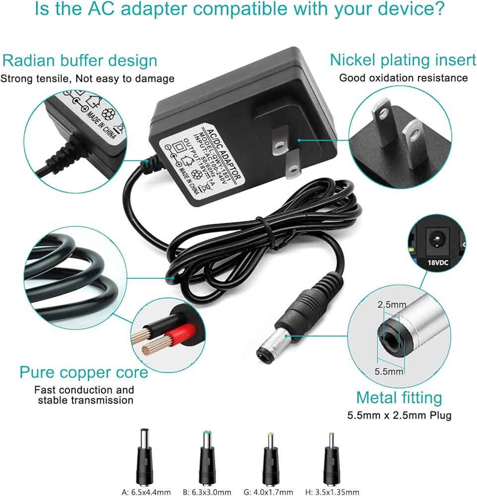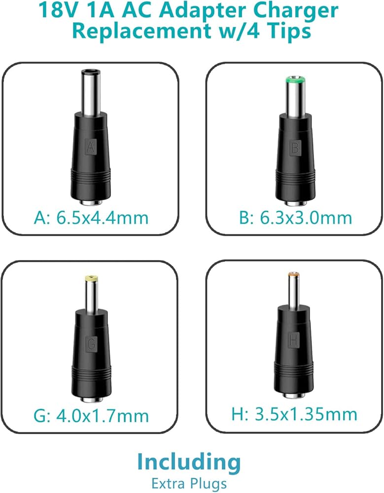 • 4.【مقابس متعددة قابلة للتبديل】تم اختيار 8 قطع من الموصلات الشائعة المختلفة التي يمكن استخدامها لمعظم أجهزة التيار المستمر 18 فولت، أبعاد مقبس التيار المستمر: 5.5 × 2.5 (متوافق مع 5.5 × 2.1)، 6.5 × 4.4، 6.3 × 3.0، 4.0 × 1.7، 3.5 × 1.35، مع دبوس داخلي. ( !!! يرجى التأكد مرتين من أبعاد مقبس التيار المستمر لضمان توافق الجهد الكهربائي 18 فولت قبل الشراء!!! )