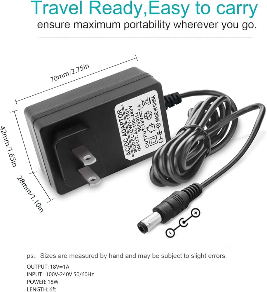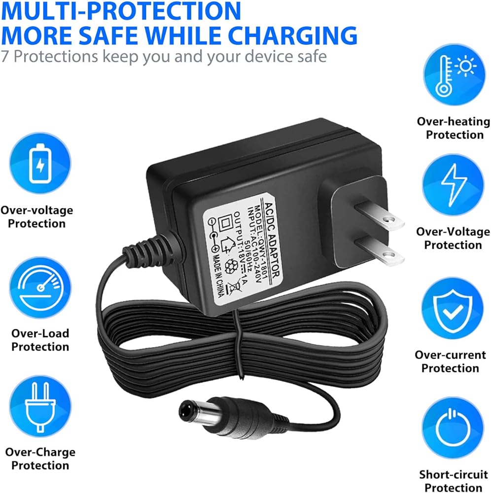 • 2.【جهاز آمن】شاحن مزود طاقة محول تيار متردد 18 فولت مع نظام أمان متعدد الحماية، حماية كاملة أثناء شحن جهازك، وظائف حماية السلامة المدعومة: حماية من درجة الحرارة الزائدة، حماية من قصر الدائرة، حماية من الجهد الزائد، حماية من التيار الزائد، حماية من الحمل الزائد. ( !!! مقبس التيار المستمر: 5.5 × 2.5/2.1 ملم، القطبية: الموجب الداخلي (+)، السلبي الخارجي (-)