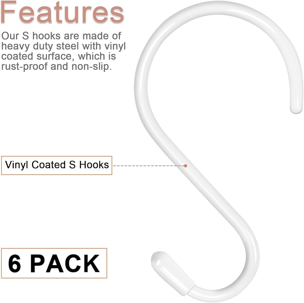 • Package Include: Pack of 6 large vinyl coated heavy duty S hooks. If you are dissatisfied for any reason, we will provide 12-month money back or free replacement.