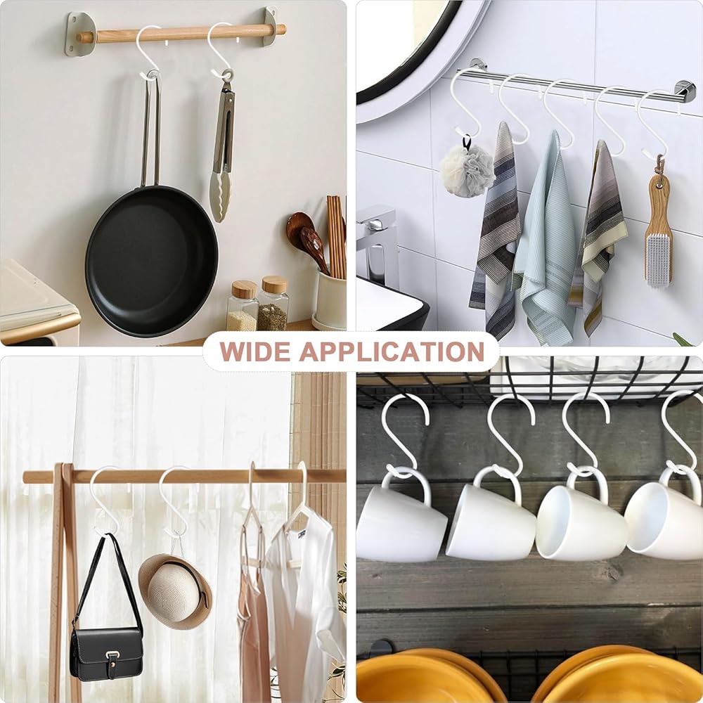 • Easy to Use: S shaped hanging hooks are easy to hang on existing objects, not need tools, nails, screws, or adhesives. A great solution to save space in your home, kitchen, bathroom, garden.